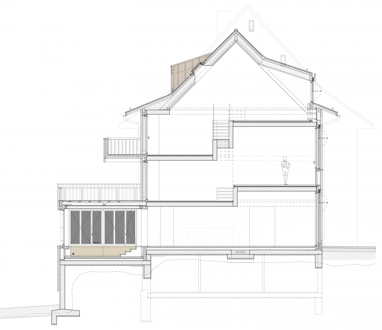 In der ortsbildgeschützten, mittelalterlichen Stadt bildet der Ersatzneubau zwischen den Brandmauern der Nachbarn das Profil des heutigen Bestandes nach. Der nördliche Schopf wird zum hölzernen Wohnraum der Eigentümer mit darüberliegender Terrasse transformiert.