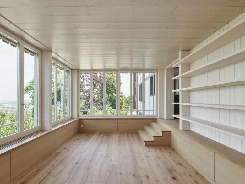 Die Gebäudehülle ist als selbsttragende, gedämmte Zimmermannskonstruktion ausgebildet, welche wie ein ortsüblicher, verputzter Riegelbau die innere Raumordnung nach aussen ausdrückt. Die Wandoberflächen des Innern mit betonierten, gemauerten oder hölzernen Wänden werden weiss geschlämmt.