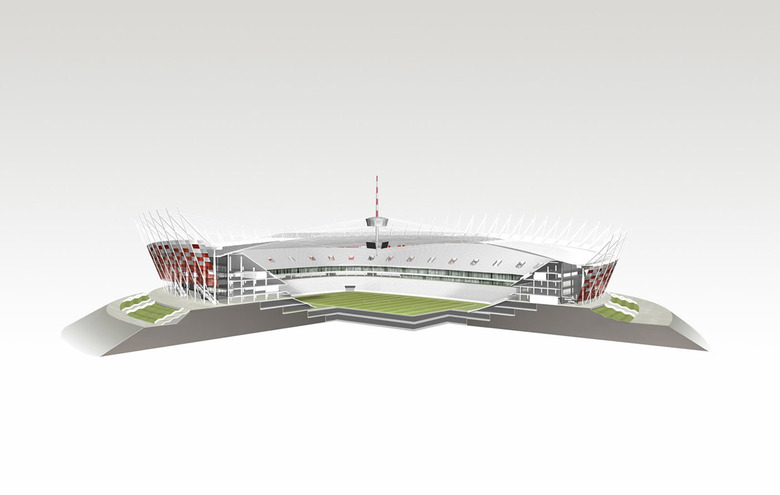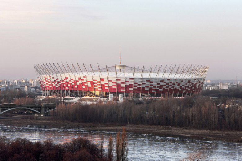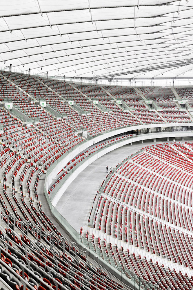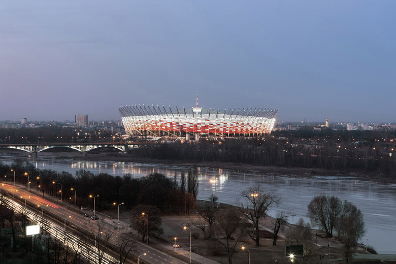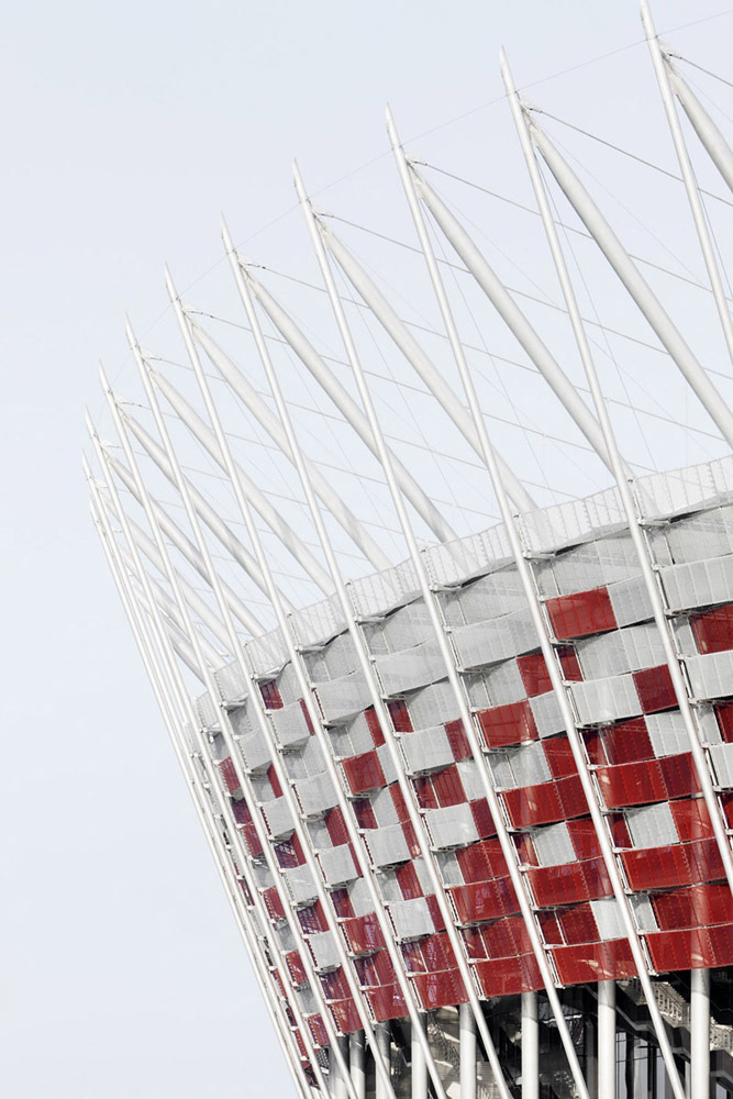 Polen und die Ukraine sind Austragungsorte der UEFA Fußball-Europameisterschaft 2012. Hierzu wird ein neues Nationalstadion auf dem bisher bestehenden, jedoch seit 1988 nicht mehr benutzten und zerfallenen Erdwallstadion „Stadion Dziesieciolecia“ errichtet, das im „Skaryszewski Park“ östlich der Innenstadt am Ufer der Weichsel liegt und das Zentrum eines neuen „Sportpark“ bilden wird. Die Konstruktion des Stadions ist konsequent zweigeteilt: die Tribüne besteht aus Betonfertigteilen. Darüber befindet sich ein Seilnetzdach mit textiler Membran, das auf freistehenden Stahlstützen mit geneigten Zugbändern auflagert. Das Innendach besteht aus einem fahrbaren Membransegel und wird über der Spielfeldmitte zusammengefaltet. In der Spielfeldmitte befindet sich auch der Videowürfel mit vier Screens für optimale Sicht auf die Bildschirme von allen Sitzplätzen aus. Der Oberrang wird über 12 bogenförmige einläufige Treppen erschlossen. Die Außenfassade besteht aus eloxiertem Streckmetall, das die eigentliche thermische Hülle der Innenräume und die Erschließungstreppen nochmals transparent umschließt. Das Stadion mit seiner Außenfassade in den Nationalfarben Polens wird im Park als weithin sichtbare Landmarke erscheinen.