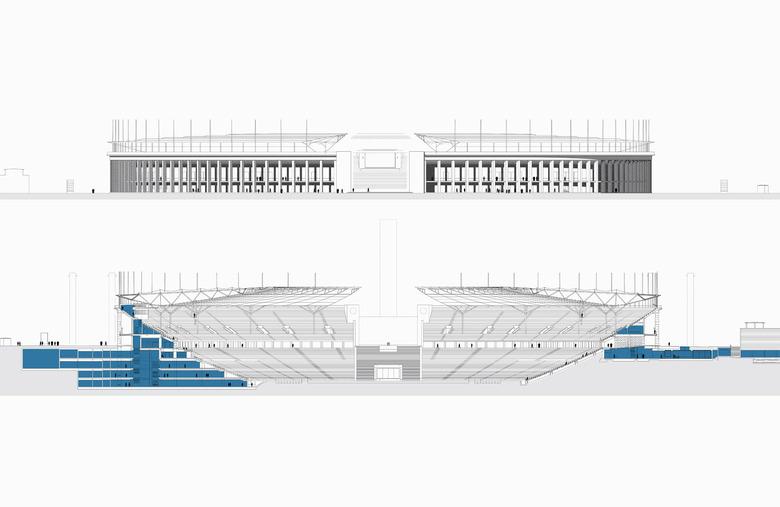 Das von Werner March 1936 gestaltete Gelände bleibt als Denkmal erhalten. Alle notwendigen Neubauten sind unterirdisch außerhalb des Stadions untergebracht. Das neue Dach setzt sich durch seine ruhige Konstruktion und die Materialwahl der Oberflächen bewusst von der festen Tektonik des historischen Stadionbaus ab und bleibt vor dem Marathontor offen. Das Dach ist als leichte Kragarmkonstruktion in Stahlbauweise mit einer Membran als oberer und unterer Dachhaut entworfen. Im Inneren ruht das Dach auf 20 Stahlstützen, die mit 25 cm Durchmesser extrem schlank ausgebildet sind.