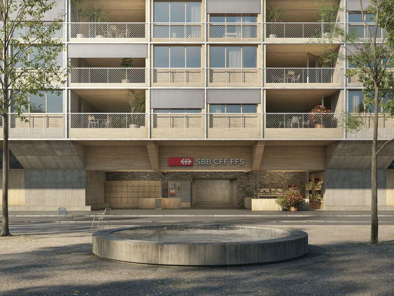 The current station building will also be given a new relationship to the street and, in the long term, will be replaced by a new building after the railroad infrastructure has been moved to the north. This will make possible a completely new, concise urban planning situation. The terrain shift from the track level to the new street level is accompanied by a retaining wall, which becomes part of the archaeology of the site. In part, the buildings stand in front of it, elsewhere the wall becomes its base. The terraced topography becomes the theme of the site.