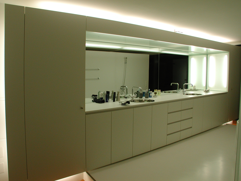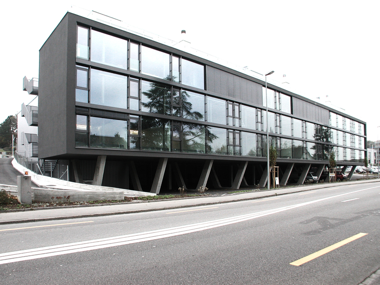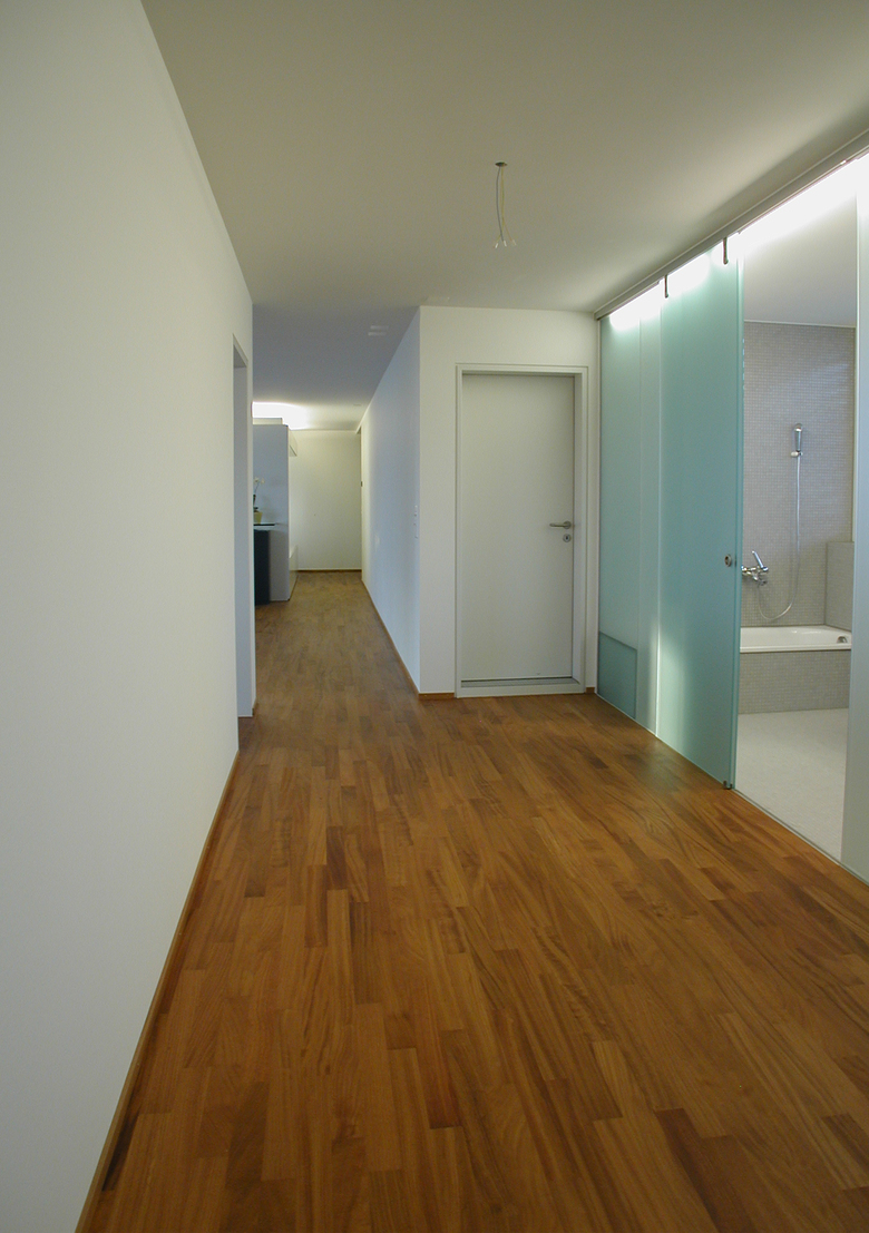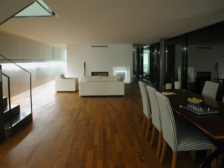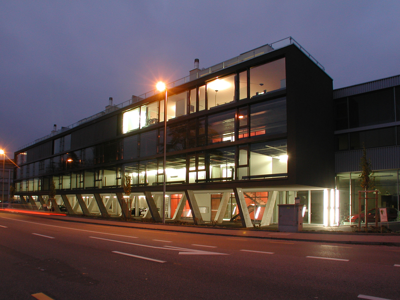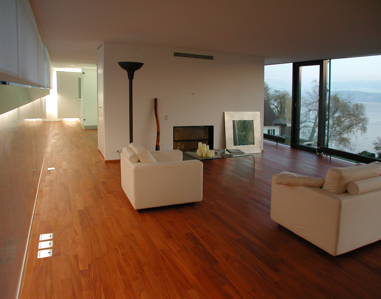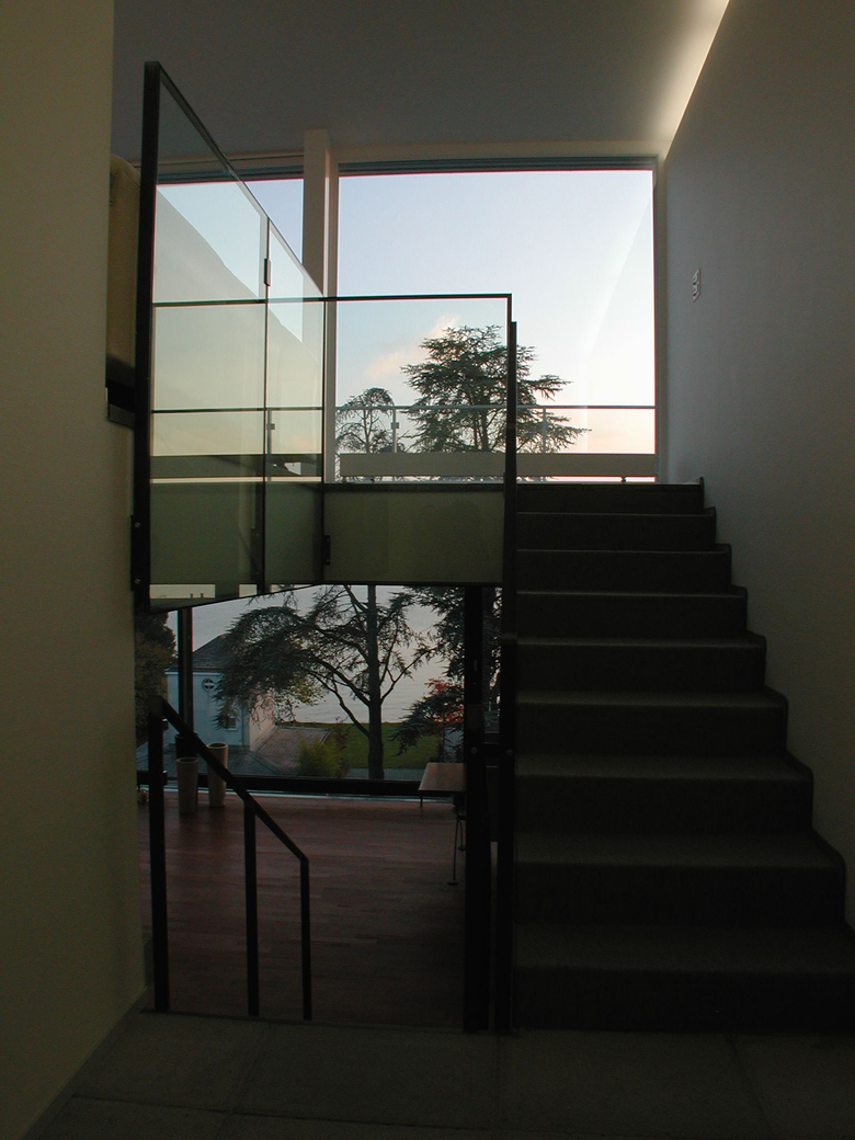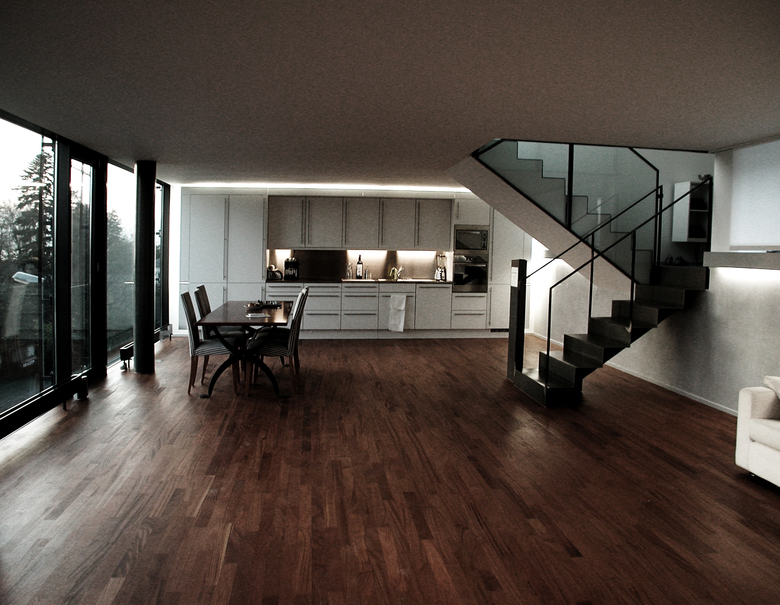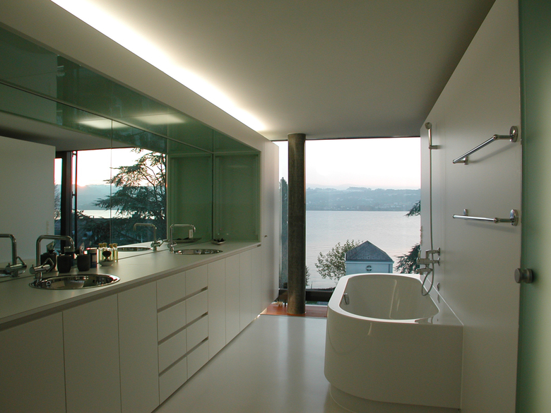 The office and loft frame has two open sides, one is totally transparent towards the lake of Zürich and the alps, the other one is manly covered by the metalbox. The difference of the two elements in plan and section are out of glass and give additional light sources from the north.