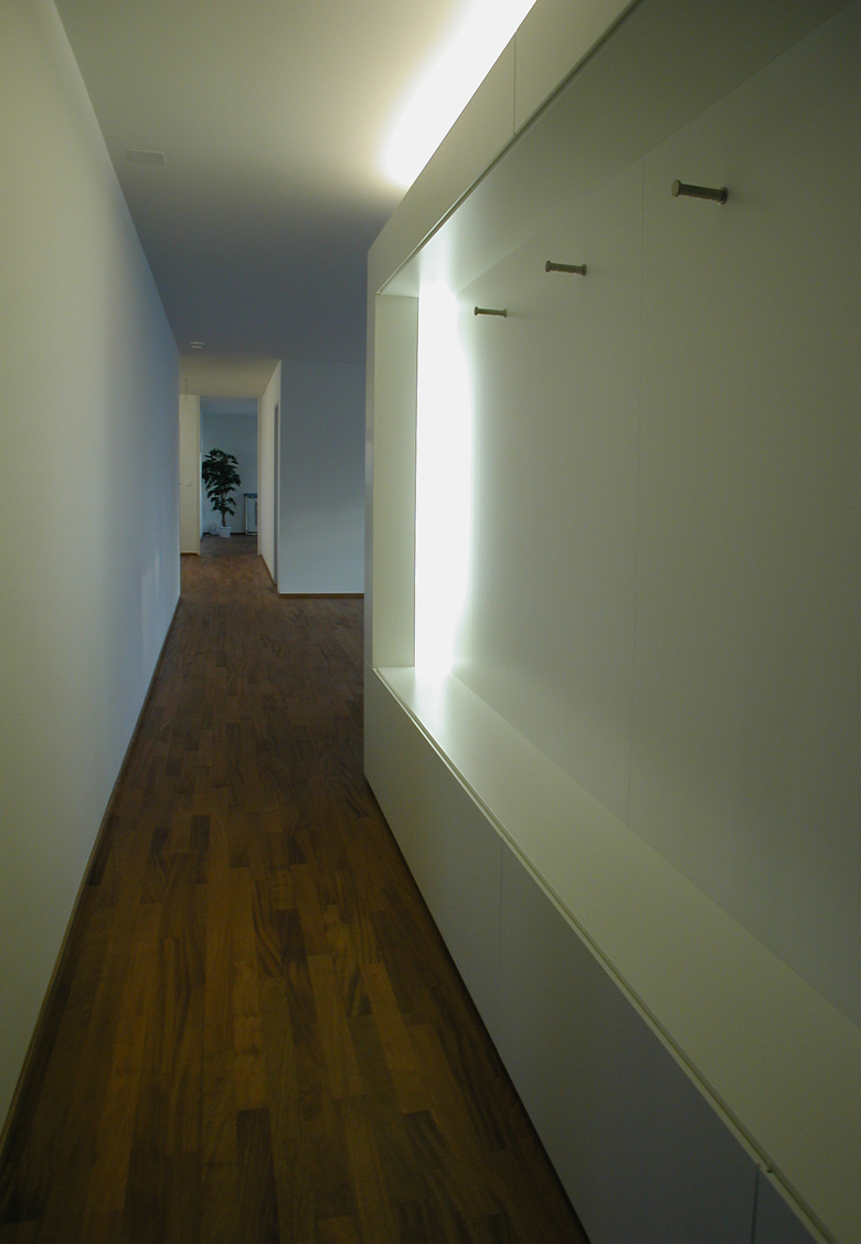 The lofts are placed on the top floor of the frame. A fire place in the center divides living and sleeping area and on both sides two installations of one is a kitchen and the other one the bath frame the living space. Those Installation walls, where they separate the lofts, are designed so they don’t touch the floor or the ceiling. They are light up at the back, so there seems to be another secret space behind it and the frame can be felt in its whole dimension.