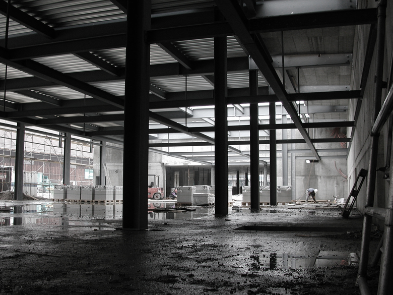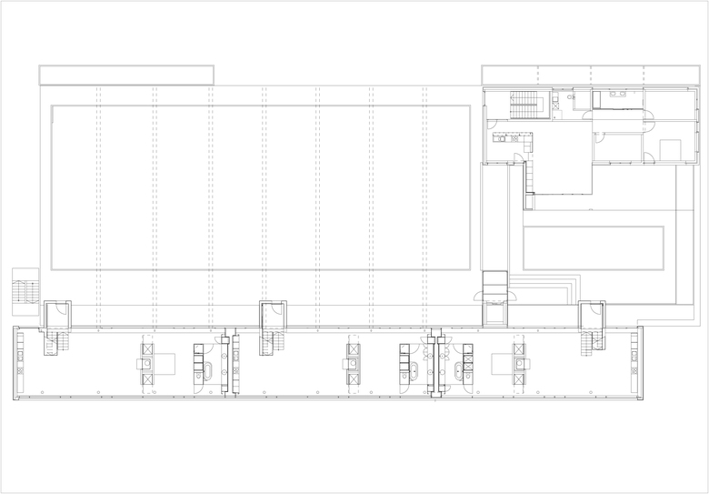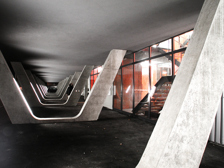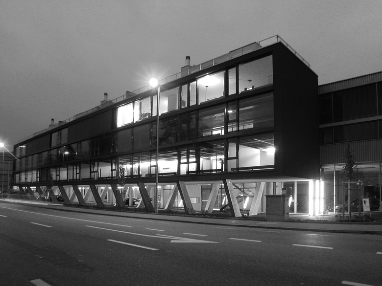This study commission asked for an overlay of various programs, such as industrial storage space, office space and residential lofts. On top of that, the client wanted to have the option of building in two phases (which he didn’t in the end). In the competition project we suggested to build an industrial box out of polycarbonate and a concrete frame resting on v-shaped pilotis, flying over the street as a reference to the lake. The plastic box would contain all industrial programs, partly cold, partly insulated, the inner shell would be seen through the polycarbonate and give hints of the inner life. At night it would be light up like a big lantern along the street.