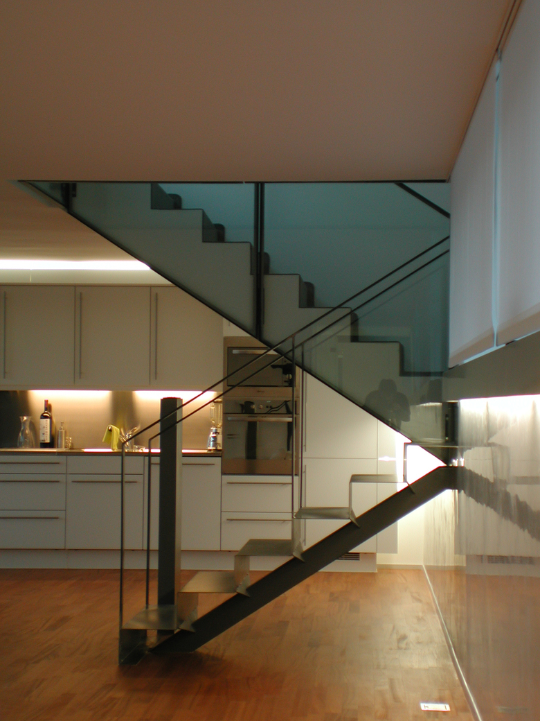 The staircase had to fulfill the clients whish to access the offices on three levels by stairs and the lift, but only the lift would access the residential lofts on the roof level. Therefore we designed the lift as a massive concrete block hitting through the metal box, generating in the same time a light volume (glass cube) that connects the staircase with the sky.