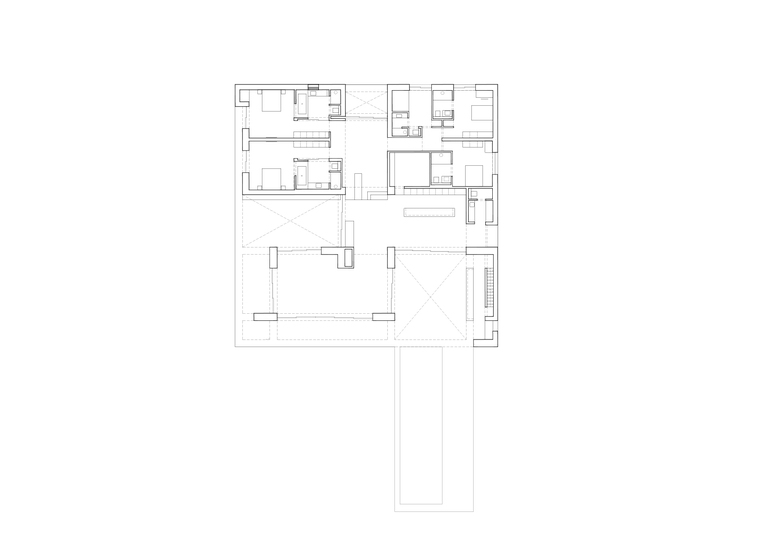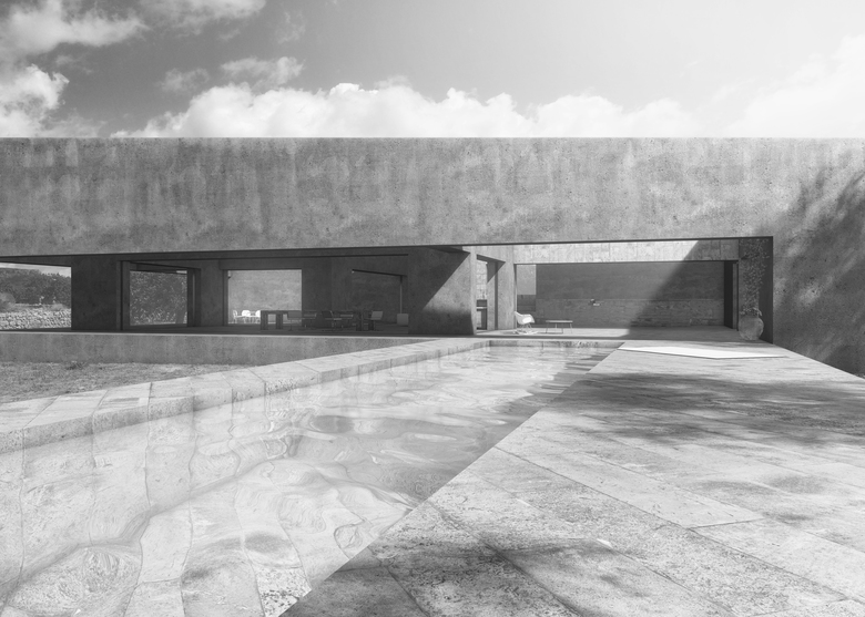 The property is surrounded by olive groves near Santanyi in Mallorca. On a gently sloping southern slope offer beautiful views of the surrounding hills and to the east in the plain to the sea. The project is generated from a simple square with the length of 26m adapted to the sloping terrain of the hill. A major concern in the site is the potential sound emissions of the road situated on the east side of the plot. The building reacts to this situation and creates a “thick” belt with a more introverted character towards north-east and south-east, which screens the sound emissions coming from the infrastructure. In the same time the volume opens up towards the main views and sunlight on south, where main living areas and swimming pool are located.