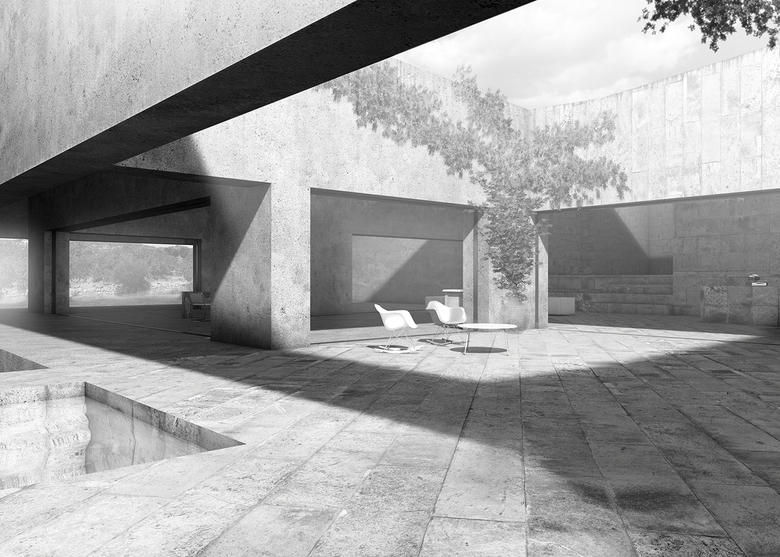 Towards south the house opens gradually the living areas towards the sunlight and the main views. A set of peripheral patios and openings deconstruct the monolithic mass in the landscape and thus dissolve gradually the limits between interior and exterior. The volume transforms here to a “perforated” structural framework that frees the circulation on the ground floor while extending over the veranda and generating semi- protected areas with creeping Mediterranean plants.