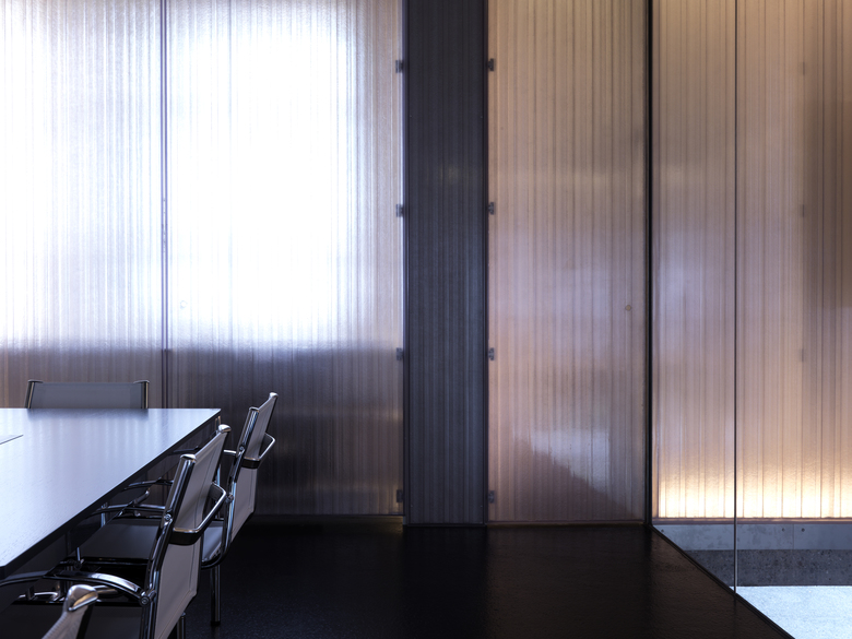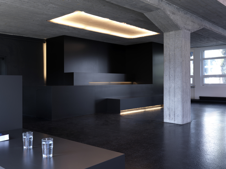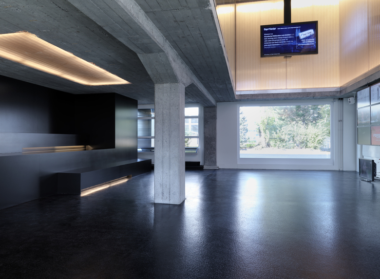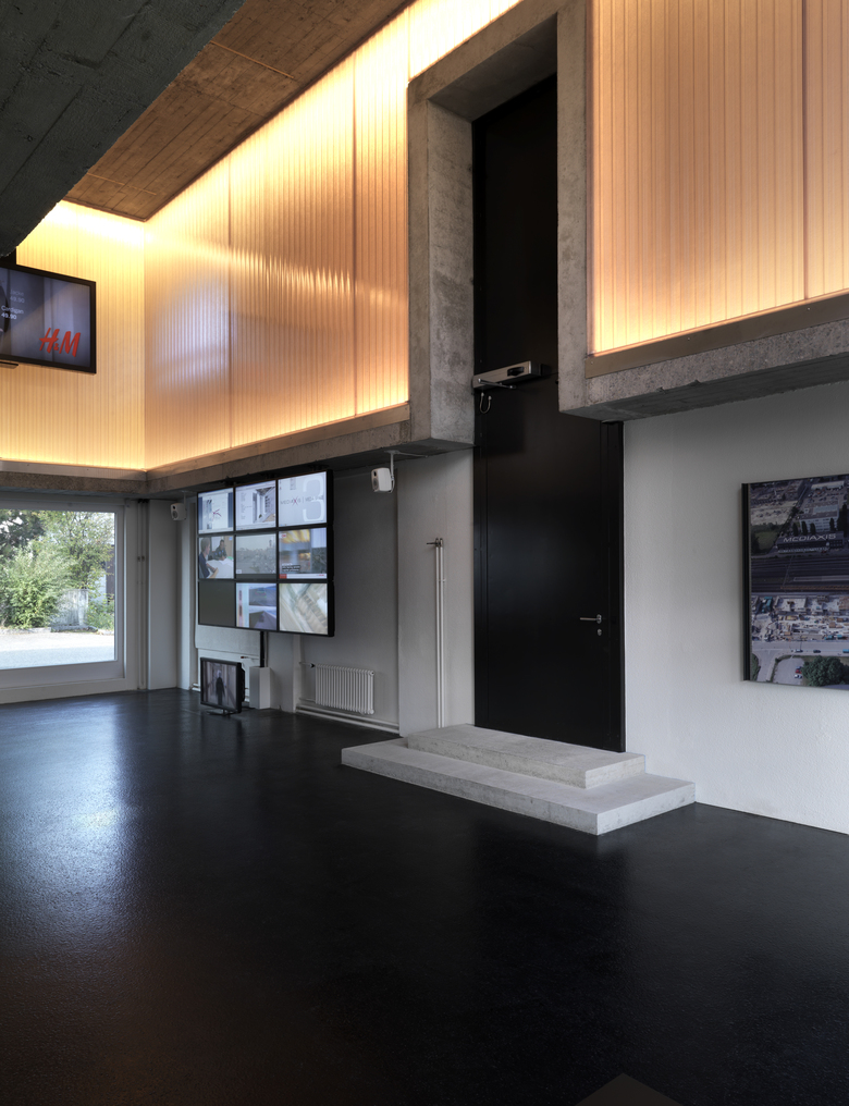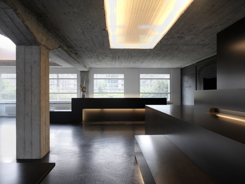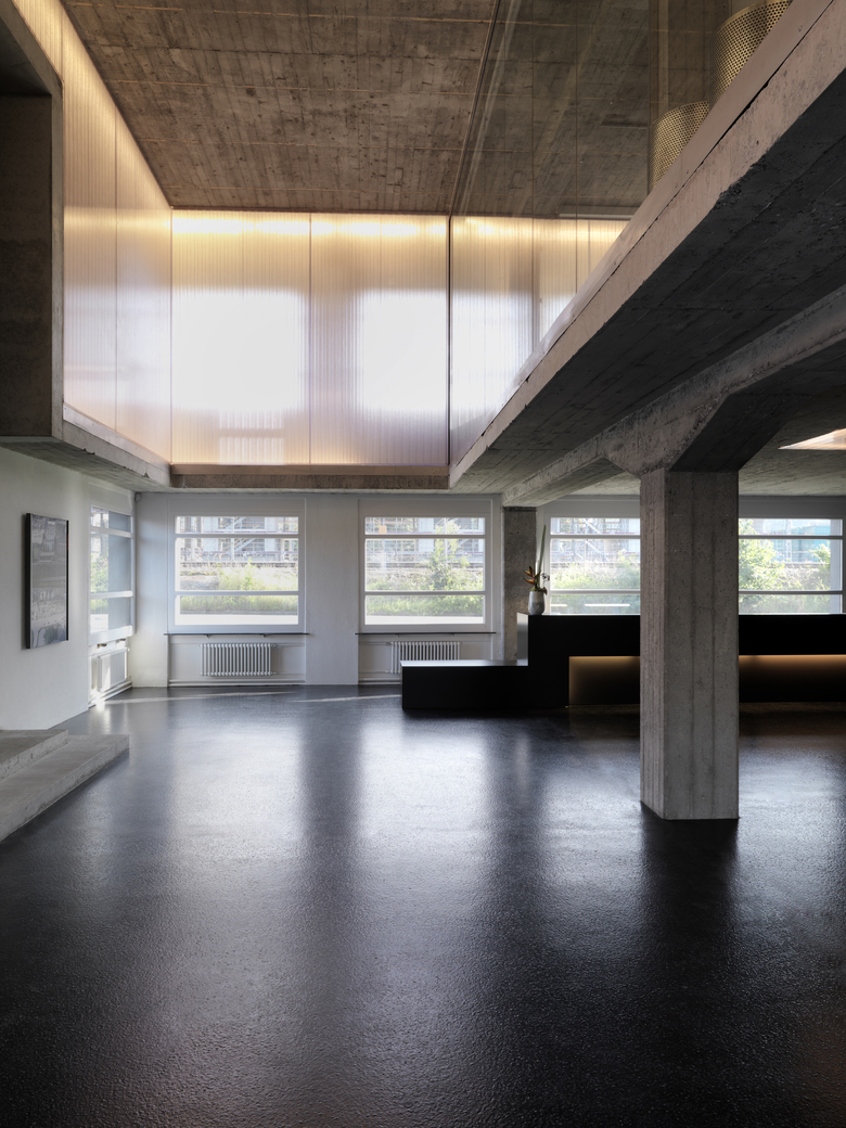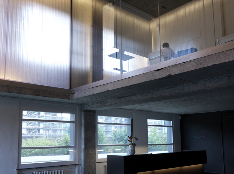 We created the high tech media lab with all the latest technologies in a very rigid old factory space. We cut a huge slab out of the concrete ceiling to get a high entrance hall with the meeting room on its gallery. The act of cutting the concrete and let it be visible stands for the ancient times of physical presence, which we call anarchy. Around the upper part of this space we set a very fine and precise light façade, actually a light space, floating above and in between all this old concrete.