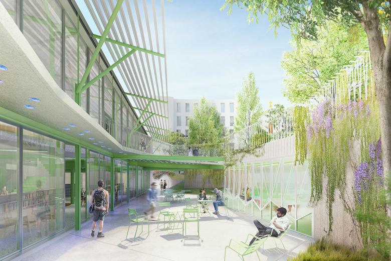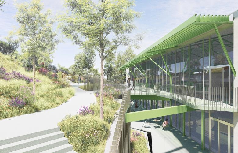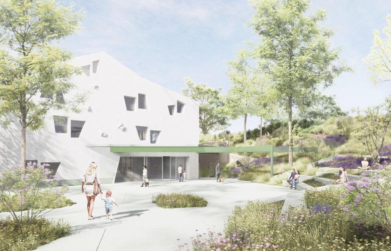 La biblioteca contará con espacios de lectura exteriores en la planta baja y un amplio balcón en la primera planta. El resto del jardín se integra en la topografía natural mediante una serie de pendientes que conectan los barrios circundantes a diferentes niveles. Frente a la fachada principal, una gran plaza acogerá todo tipo de eventos cívicos, reforzando el papel de la biblioteca como centro comunitario.
