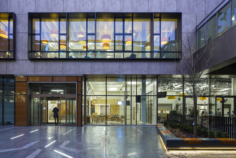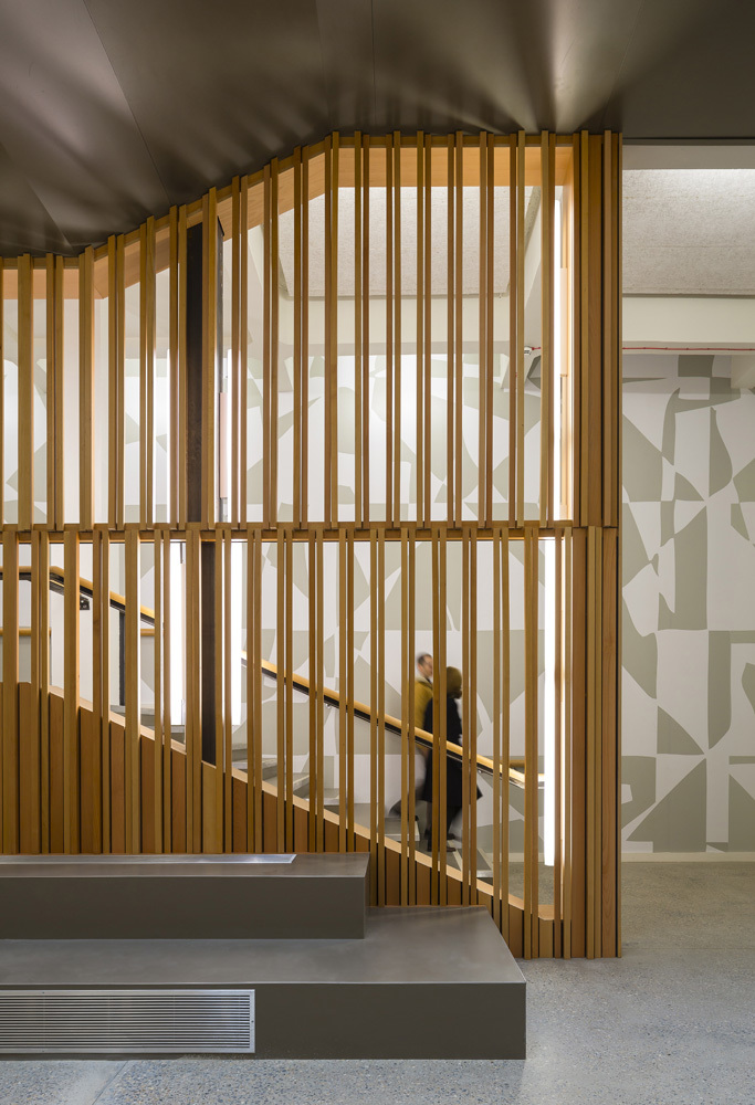 Internally a central void and rooflight at first floor level bring light into the foyer and ensure greater connectivity between the two floors. The work of David Bomberg, a prominent English painter, who taught at LSBU during the 1940’s and 50’s, provides inspiration for a bold geometric pattern on a feature wall in the foyer as well as in the hard landscaping at the Borough Road and Kell Street entrances. Inside the aesthetic is redolent of a boutique hotel lounge with ambient lighting and soft furnishings with splashes of colour, creating a convivial environment conducive to informal learning. This is an approach well rehearsed by the practice on higher education projects such as Coventry University Hub, Kent School of Arts, and Oxford University New Biochemistry.