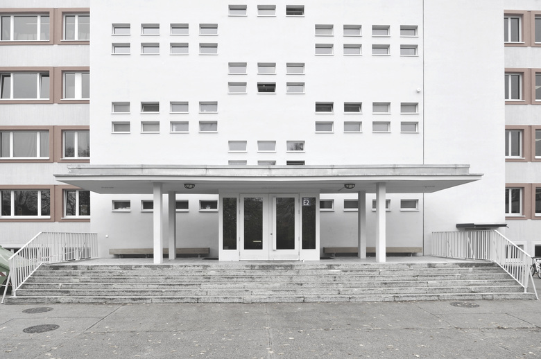 Die vorgefundenen Fensterbänder an der Nord- und Südfassade wurden als umlaufendes Band auf die gesamte Fassade projiziert. Die bestehenden Brüstungselemente aus Stahlbeton wurden erhalten und außen nach energetischen Vorgaben gedämmt. Die Einbaulage der Bestandsfenster wird bei der Erneuerung der Fenster wieder hergestellt. Durch den Aufbau der Dämmung auf den Brüstungselementen, den neuen Fensterrahmungen und den dadurch tiefer liegenden Fenstern in drei Ebenen wird die Plastizität der Fassaden verstärkt und das Konzept des Bandes betont. Der Rhythmus der Fensterumrahmungen bildet die Folge der Klassenzimmer und das innere Stützenraster ab.