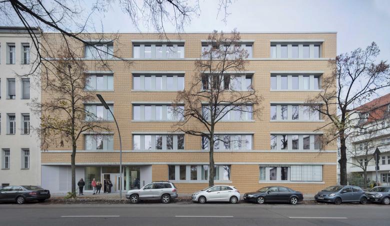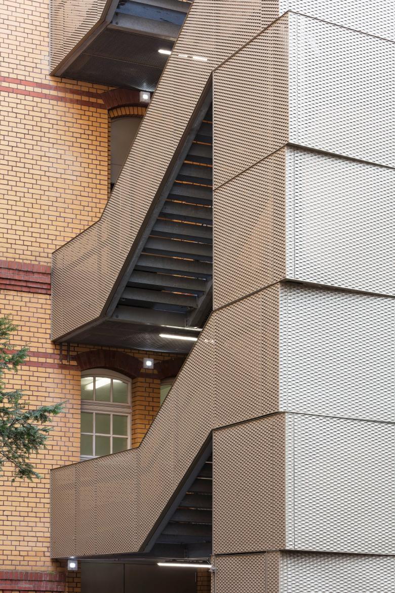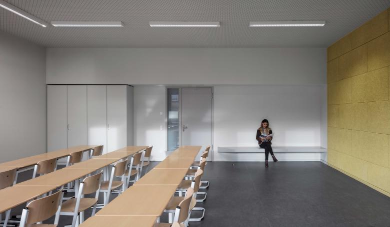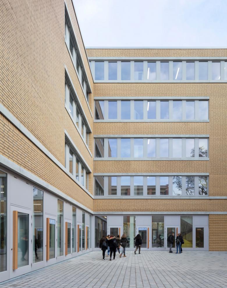 Der fünfgeschossige Neubau schließt direkt an den Altbau an. Er setzt das Altbauvolumen in Höhe und Breite fort, definiert an städtebaulich wichtiger Stelle die Raumkante zur Stadt neu und bildet zum Schulcampus ein Staffelgeschoss aus.