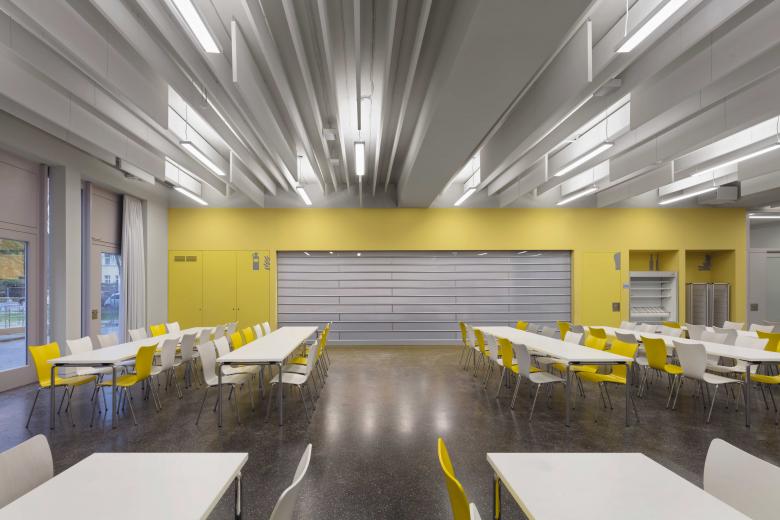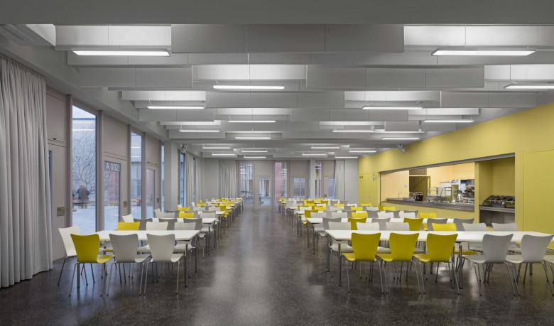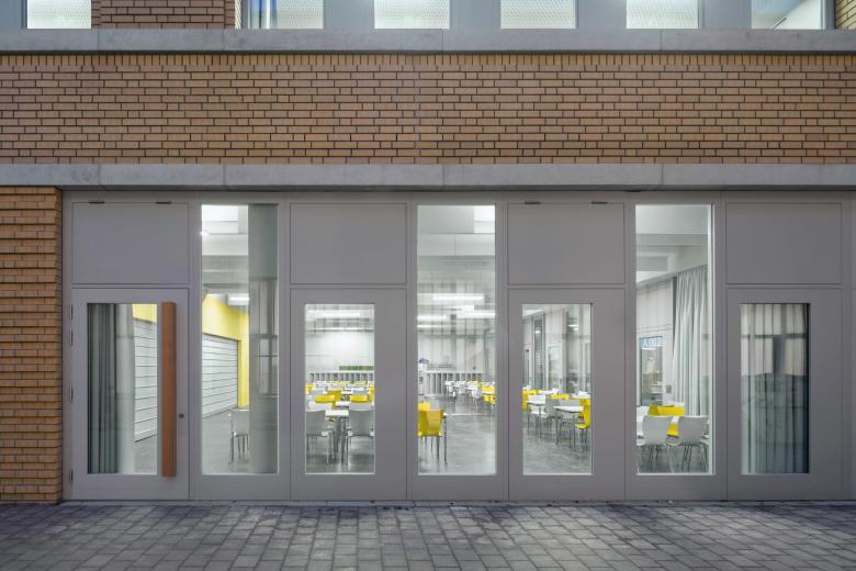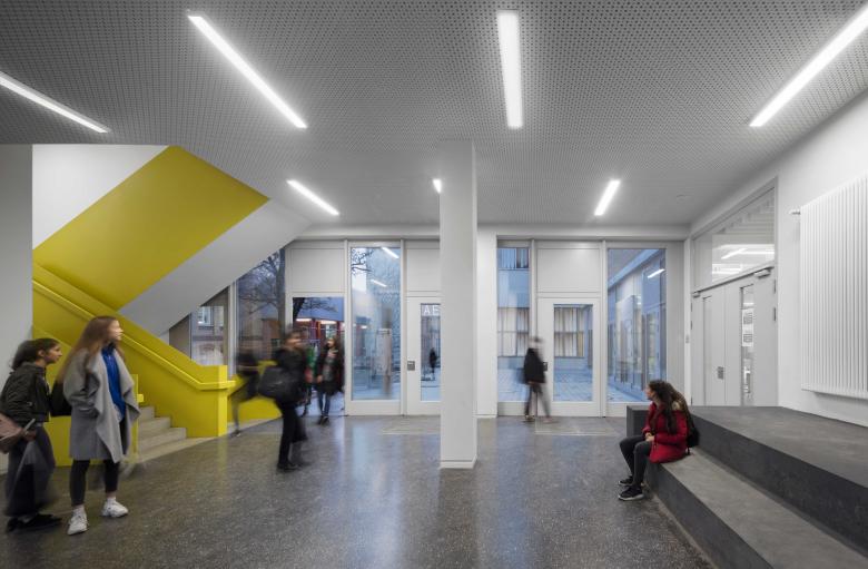 Eine offene Treppe mit Aufzug verbindet die verschiedenen Niveaus der Geschosse des Altbaus mit denen des Neubaus im Sinne der erwünschten Inklusion. In den Unterrichtsclustern weiten sich Verkehrsflächen zu flexibel nutzbaren Bereichen. Altbauflure öffnen sich im Neubau zur innenliegenden Schulterrasse mit Baum, dem gemeinsamen Raum mit Identifikation stiftender Intimität. Die Organisation des Schulhauses ist von dieser Idee bestimmt.
