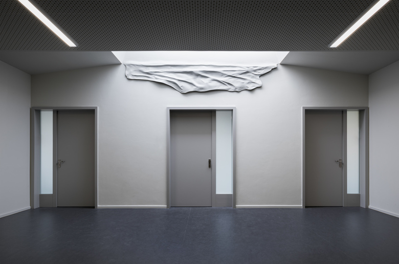 Die Steinfassade des Altbaus zum Schulhof wurde weitergebaut und umkleidet nun, wie ein Steinkleid, auch den Neubau. Neubau und Altbau werden fest zu einer formalen und funktionalen Einheit verbunden.