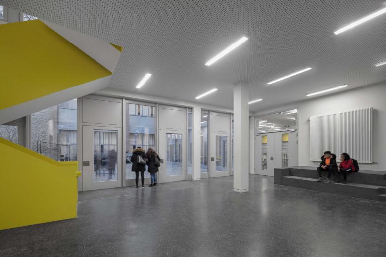 Der Haupteingang von der Lepsiusstraße erfolgt nun über einen gedeckten Vorbereich in ein großzügiges Schulfoyer. Der öffentliche Raum ist die Adresse.