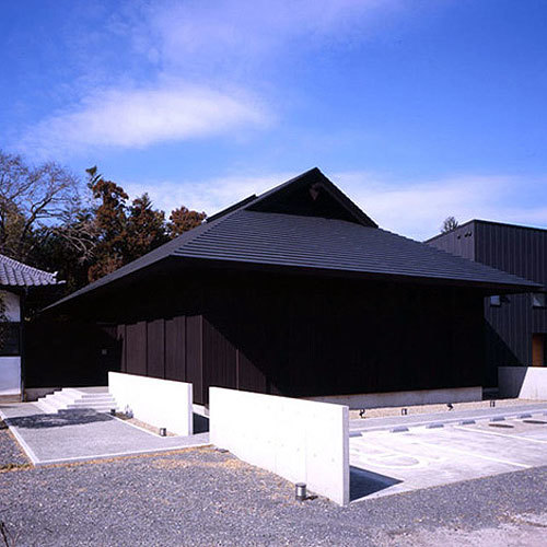 The interior has a functional plan, and the exterior is composed of a roof shape and a cedar board outer wall that blends in with the area, with the intention of confronting and harmonizing with the old main hall.The cedar hanging lattice doors that cover the exterior are also painted with the traditional Kumezou finish, giving the building a veiled appearance and creating a tranquil atmosphere in the precincts.