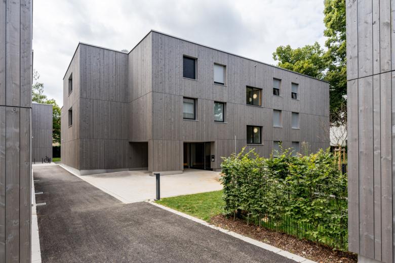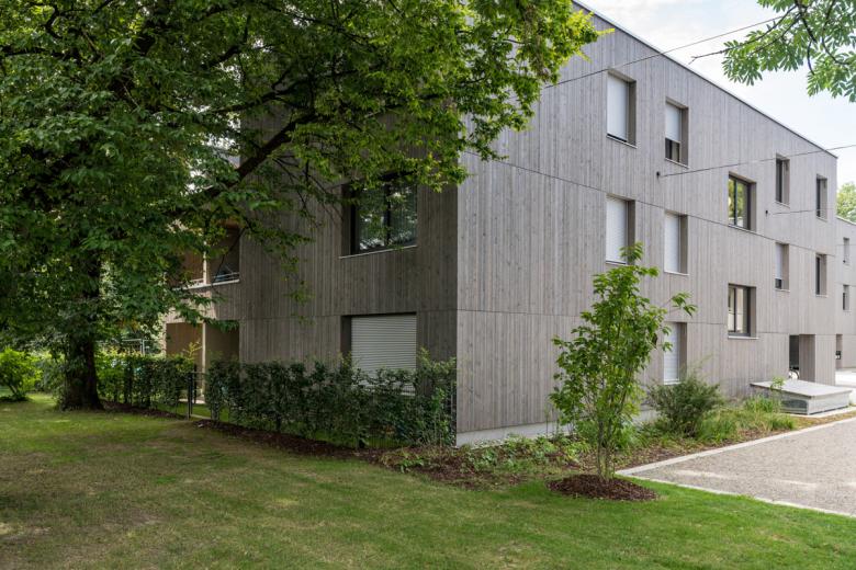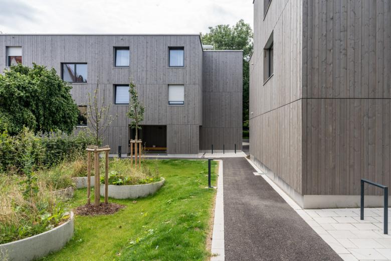 Angestrebt wurde eine qualitätsvolle Verdichtung, die durch ihre kompakte Bauweise und die sorgfältig gestalteten Freiräume ein ansprechendes Umfeld schafft. Die versetzte Anordnung der dreigeschossigen Volumen entlang der Nord-Süd-Achse erzeugt ein mehrschichtiges Raumgefüge, das jeder einzelnen der 74 geförderten Wohnungen maximalen Lichteinfall, geschützte Außenbereiche und vielfältige Blickbeziehungen in den Grünraum gewährt. Die nach Süden orientierten Einheiten im Parterre profitieren von einer optimalen Besonnung, während die räumliche Komprimierung in Ost-West-Richtung eine effiziente Nutzung der Flächenressourcen ermöglicht. So entsteht ein Ensemble mit dem angenehmen Charakter einer sorgfältig komponierten Kleinwohnanlage, die sich zurückhaltend in die bestehende Siedlungsstruktur fügt.