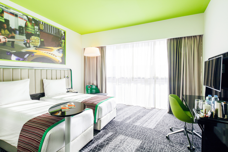 With a total of 147 guest rooms units, the interior design provide continuity to the racing story, but in a more subdued manner and through details like old racing photographs or bed covers which mimic chequered flags. Comfort is the main aim of the proposal. This is achieved with brightly painted walls and a choice of playful yet colorful furniture which enhances rest after a busy day racing or sightseeing in Dubai.
