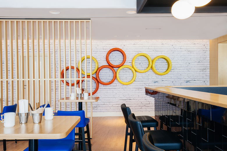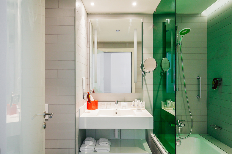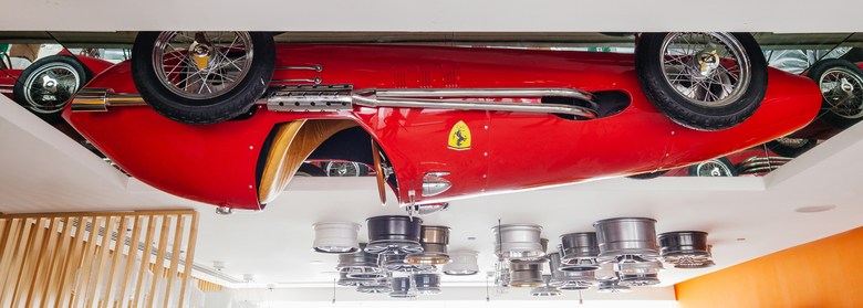 Vintage cars suspended from the ceilings, corridors that resemble a circuit with pedestrian crossings located in front of the lifts, or different car parts like alloy wheels and tires painted in different colors which hang from the walls of the lobby and restaurants give a sense of adventure and fun, all in a contemporary and relaxed setting, with a strong sense of place. This twist complements the international style employed in the choice of materials and palettes in order to make the racing objets stand out and at the same time naturally integrating them into the decoration.