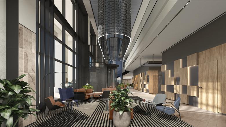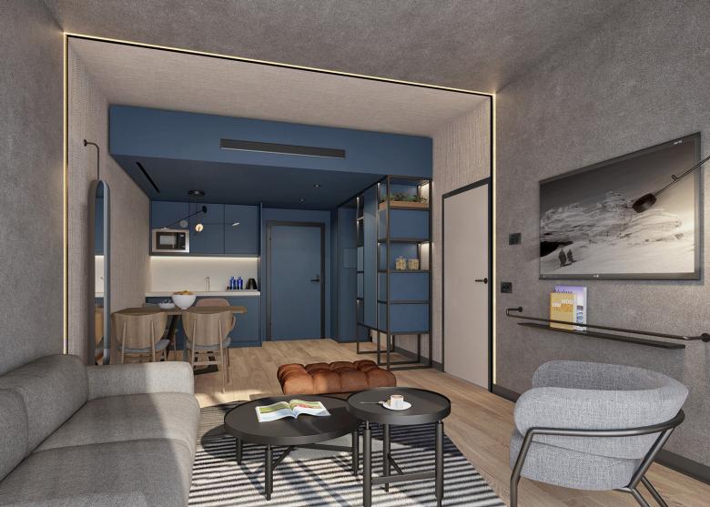 The design code focuses on providing a modern look and stylish atmosphere without sacrificing warmth. It strongly highlights a key element that is common to all spaces: color. The combination of the selected palette used in all rooms, apartments and public areas serves to achieve a dynamic design and a calm environment.