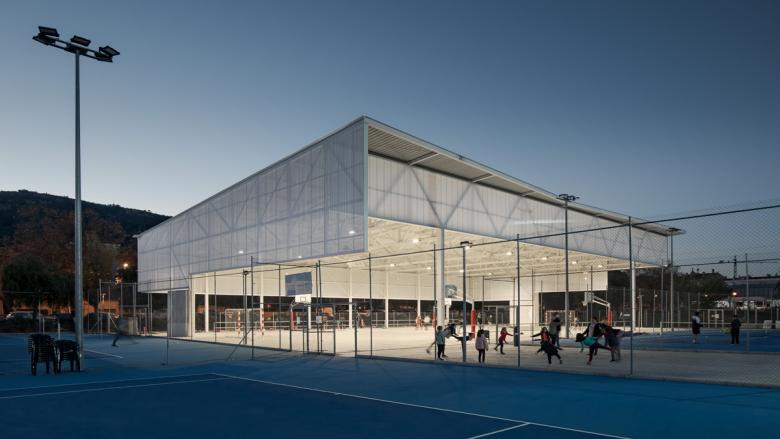 From the outside, the skin appears airtight. The gaze only penetrates where there is no envelope, and concentrates attention on the ground plane. Once inside, under cover, this hermetic envelope becomes a curtain that sifts the urban environment, and blurs this reality to establish a direct visual relationship with the sports activity, in the foreground, and with the landscape, on the horizon . At night, the cover is stripped. The interior light is a claim, at the same time that the interior is perceived from the city, it is explained outwards and lightened.