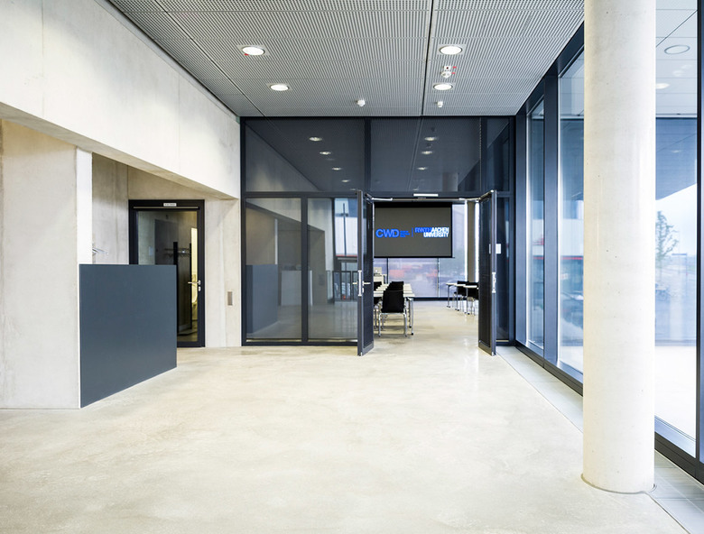 Baukörperform und Fassade spiegeln die innere Organisation des CWD wider. Das Forschungszentrum besteht aus zwei Nutzungsbereichen: einem Bürotrakt zum Campusboulevard hin und einer sich anschließenden, 75 Meter langen Halle für die Durchführung der Experimente. Dazwischen liegt eine Pufferzone mit Haupterschließung und Nebenräumen.