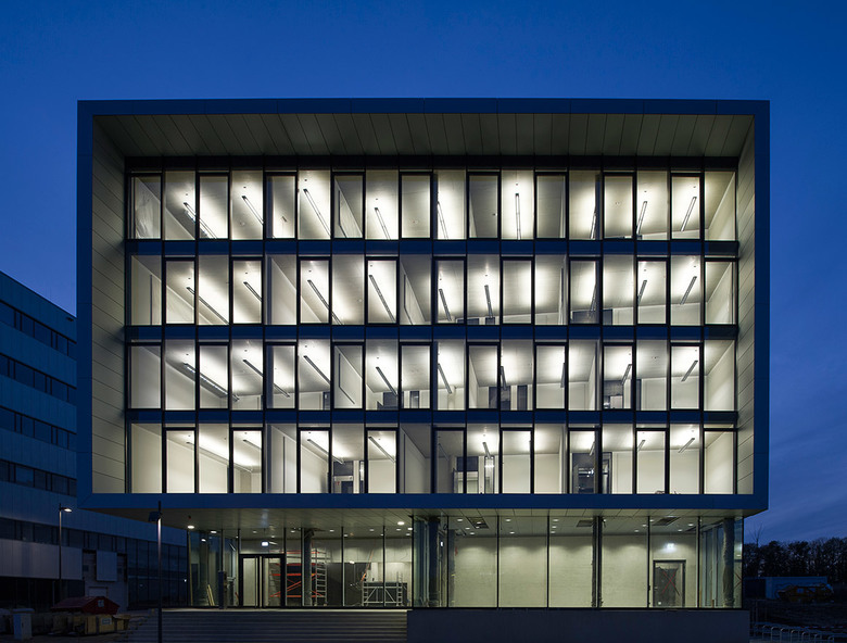 Im Kopfteil des Gebäudes liegen über dem Foyer auf vier Etagen Büro-, Projekt- und Sozialräume. Wie auch im Sockelbereich ist die Fassade hier komplett verglast und bildet ein markantes „Boulevard-Fenster“, welches außen durch den kragenartigen Abschluss der seitlichen Metallfassade gerahmt wird.