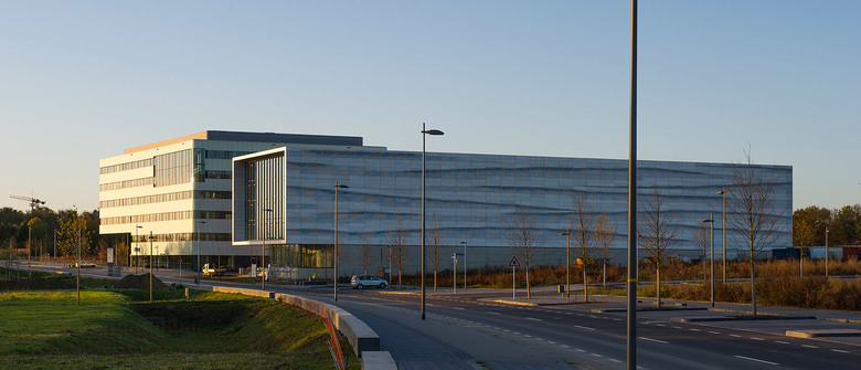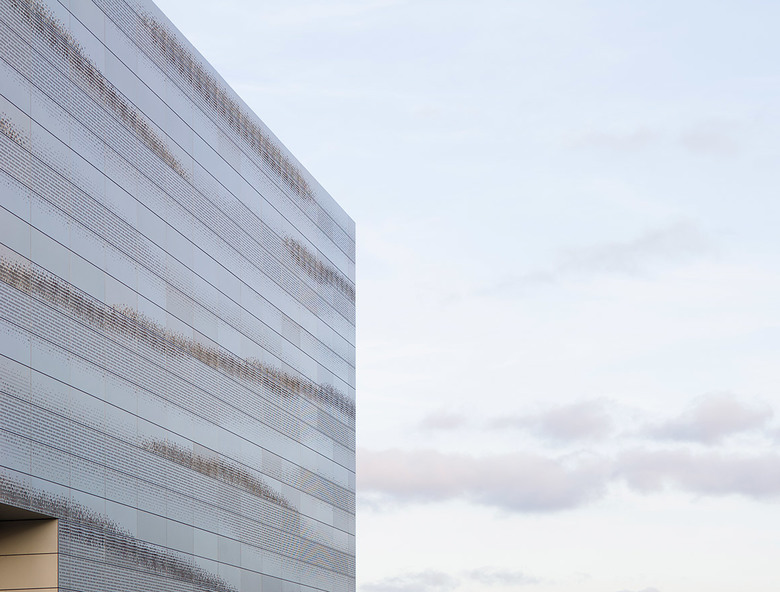 Die Metallfassaden an den Längsseiten scheinen wie vom Wind geformt zu sein. Die Vorhang-konstruktion aus silbernen, unregelmäßig gelochten und dreidimensional geprägten Aluminium-Paneelen ergibt eine dynamische Wellenoptik, die die Eleganz des Baukörpers unterstreicht.