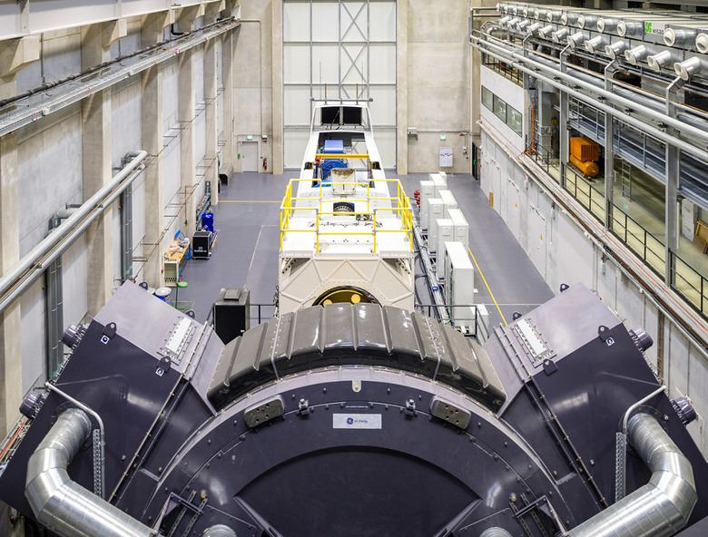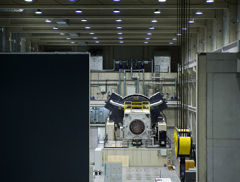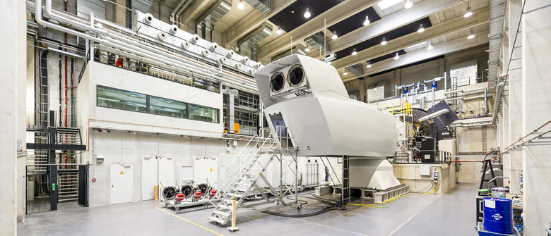 Der Hallenteil beherbergt neben dem Versuchsstand mit großzügiger Anlieferzone entsprechende Montagebereiche, Technikräume und Lagerflächen. Eine große Kranbahn zur Montage der Windanlagen-Gondeln auf den Prüfstand überspannt die Halle in Querrichtung und hat ein Lagegewicht von 120 Tonnen.