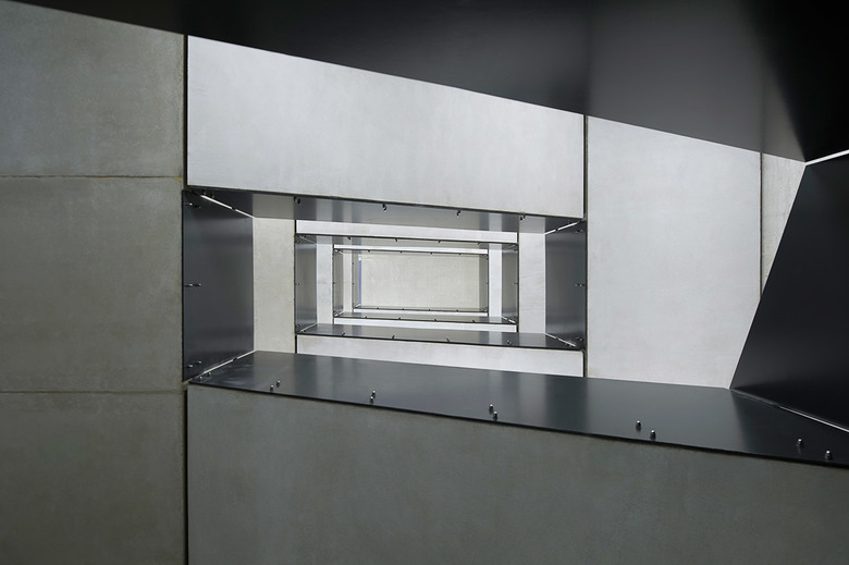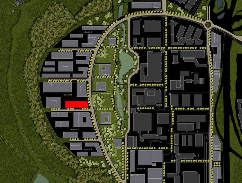 Der schlanke Baukörper des „Windkanals“ ruht auf einem massiven Sockel, der sich aus dem Hang schiebt. Nur zum Boulevard des neuen Campus‘ hin ist dieser im Bereich des Foyers und des Seminarraums verglast und so einladend geöffnet. Darüber legt sich ein scheinbar schwebender Baukörper, der hülsenartig mit Aluminium-Paneelen bekleidet ist.