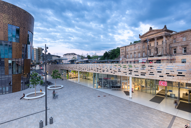 Die teilweise perforierte Kalksandstein-Fassade von Parkhaus und Mall prägt die Situation der neuen Fußgängerzone vor dem Bahnhof. Der obere und der untere Platz wurden, wie seinerzeit die Bahntrasse, aus dem anstehenden Fels herausgearbeitet. Die steinerne Fassade soll daran erinnern. Die Materialfarbe orientiert sich an der Farbigkeit des historischen Empfangsgebäudes. Die vorgehängte Steinfassade bildet neben einigen Vollverglasungen die Platzkante und übergangslos die Brüstungen darüber. Die Perforationen belichten und belüften die Tiefgarage und Teilbereiche der Mall.