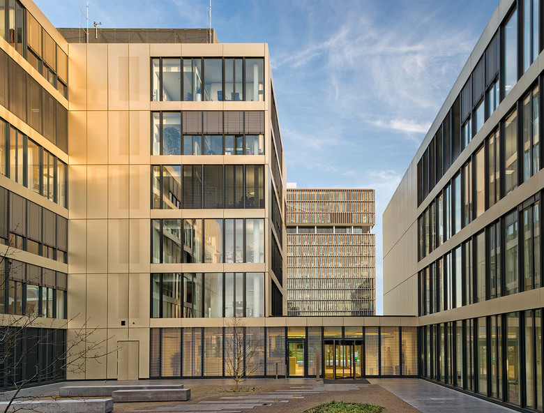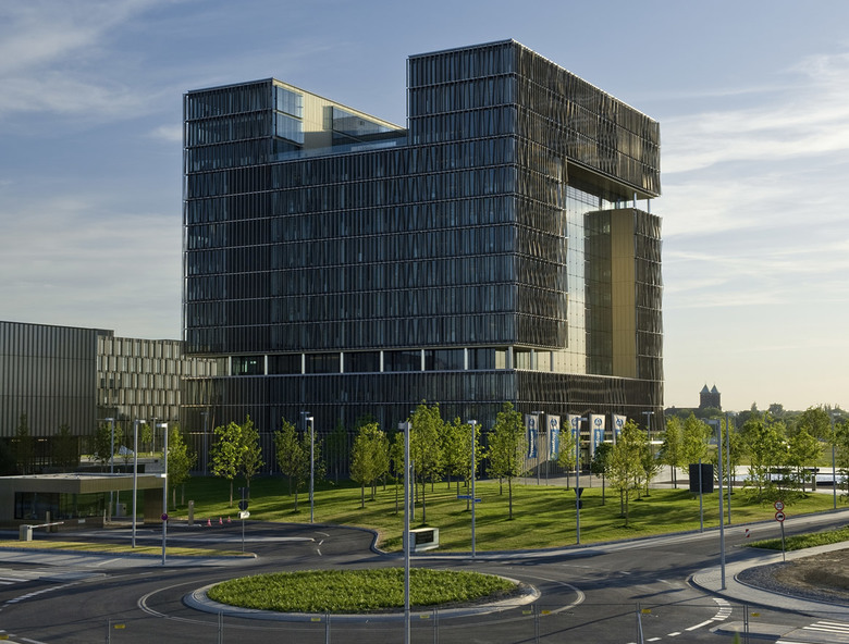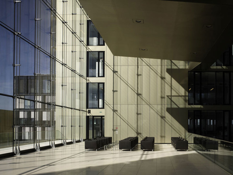 L-förmige Gebäudeteile fügen sich jeweils um eine gemeinsame Mitte - mal als glasgedecktes Atrium, mal als Innenhof ausgeführt. Eingeschnittene Eingangsbereiche und Loggien strukturieren die Fassaden, die geprägt sind durch Offenheit und Transparenz – entsprechend der Außenwirkung des gesamten, öffentlich zugänglichen Campus. Das Prinzip einer „rauen Schale“ in Form von plastischen Metallfassaden mit außenliegendem Sonnenschutz und dem „warmen Kern“, gebildet durch helle Glattblech-Bekleidungen von Innen- und an Loggia-Fassaden, zeigt sich hier wie auch an allen anderen Gebäuden des Thyssenkrupp Quartiers als architektonische Leitidee.