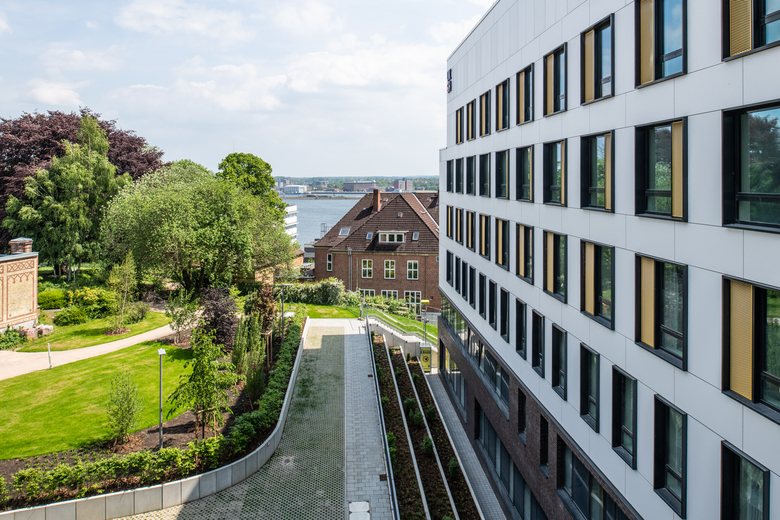 Der neue Vorplatz ist der zentrale Orientierungspunkt des gesamten Klinikums. Von hier aus sind die Wege zu weiteren Fachbereichen und neu entstehende Kompetenzzentren kurz. So findet auch das Kopfzentrum für HNO-, Augen- und Zahnmedizin seine neue Adresse. Der größtenteils denkmalgeschützte Bestandsbau der HNO-Klinik wird sensibel umgebaut und erweitert. Zur Förde hin bildet schließlich das Mutter-Kind-Zentrum den Schlussstein des Komplexes, der nach dem Rückbau der bestehenden Frauenklinik von Patientengarten, Förde und Botanischem Garten grün gerahmt sein wird.