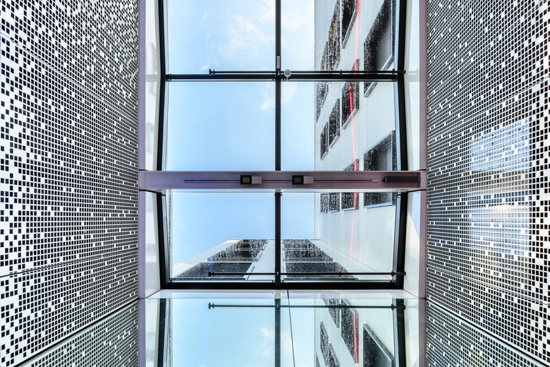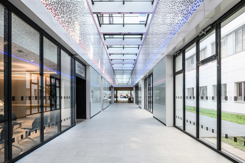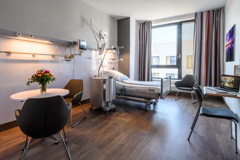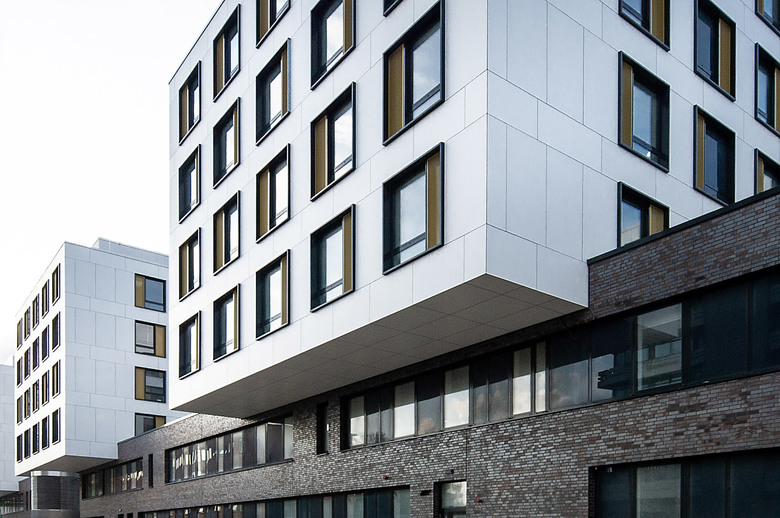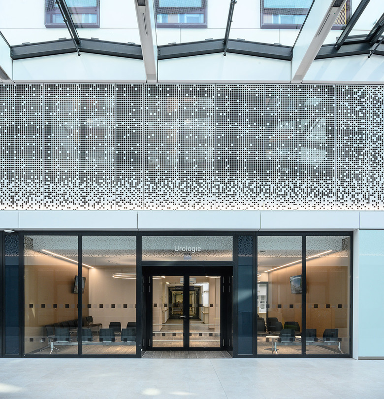 Während die Sockelzone regional typisch verklinkert ist, sind die Fassaden der Bettenstationen darüber hell gestaltet. Die fast weißen Faserzementplatten haben zusammen mit den goldfarbenen Sonnenschutz-Elementen aus Steckmetall einen eher wohnlichen Hotelcharakter. Die Neubauten zur Klinikums-Erweiterung sind fertiggstellt. Die Umbauphase läuft noch bis 2022.
