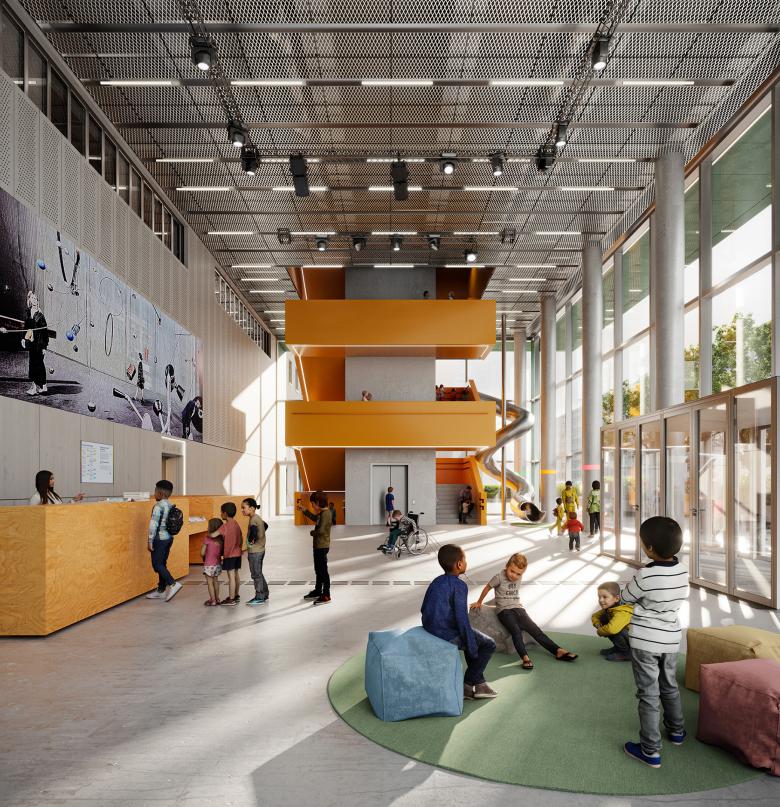 Die im Foyer geplante LED-Wand kann diverse interaktive Installationen speziell für Kinder und Jugendliche projizieren. Diese virtuelle Kunst wird über die raumhohe Verglasung auch in den öffentlichen Raum getragen.