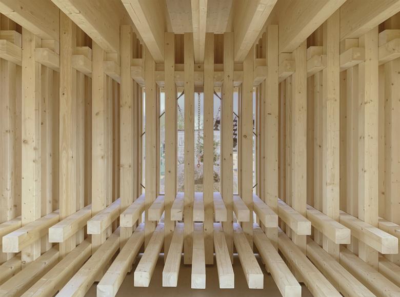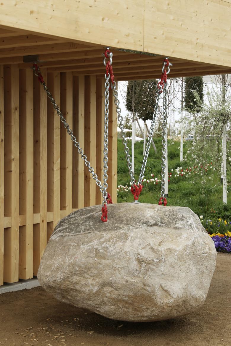 Auf der Ausstellungsfläche des “Erlebnisraum Bioökonomie” im südöstlichen Teil des Spinelli-Parks, gliedert sich das zu bebauende Grundstück der Holzbau-Offensive BW und der Landesforstverwaltung ein. Der langgestreckte Baukörper setzt sich an die schräg laufende Grundstückskante und leitet den Besucher somit über das Ausstellungsgelände. Um den Inhalten und Ansprüchen der Holzbau-Offensive BW gerecht zu werden besteht der gesamte Pavillon aus Holz und zeigt die Möglichkeiten des modernen Holzbaus auf. Das weit auskragende Dach scheint zu schweben. Es lädt zum Verweilen und zur Betrachtung der Ausstellung ein. Darunter mobil angebrachte Sitzmöbel aus Holz bieten die Möglichkeit, geschützt vor Regen und Sonne, beispielsweise Veranstaltungen mit Schülern durchzuführen. Ein aufgehängter Stein, am Ende des Daches, stellt sich der Schwere der Auskragung entgegen und stabilisiert dieses durch sein Gewicht. Das Dach liegt auf einer massiven Box aus Holz und einer Stützenansammlung auf. Durch die Anordnung der beiden Elemente entsteht ein geschützter Raum. In diesem Holzkino sind Film-Präsentationen und kleine Zusammenkünfte möglich. Im Außenraum werden die Klimabäume und Wendeblätter aufgestellt.