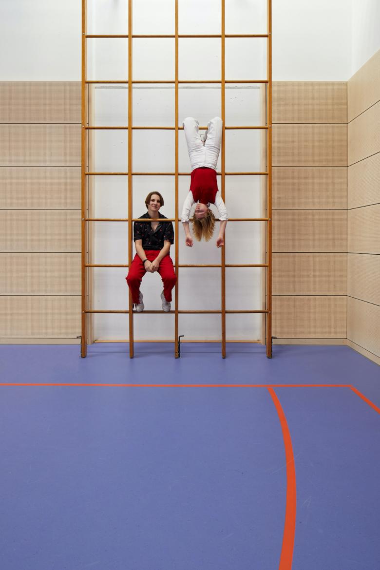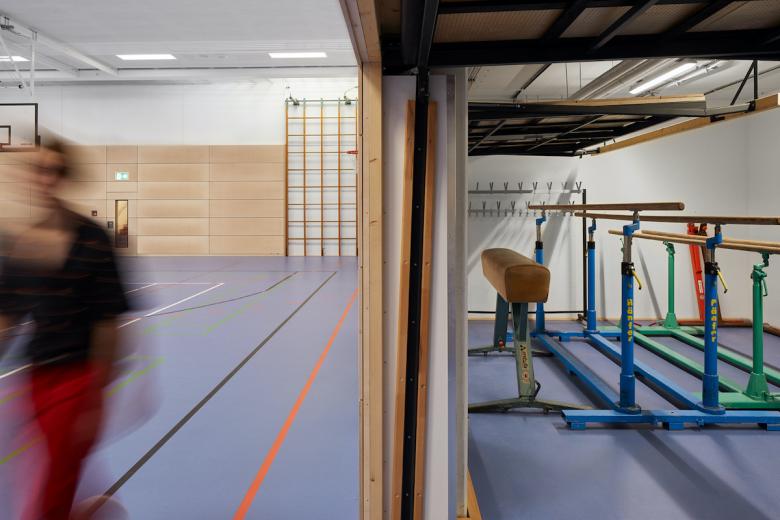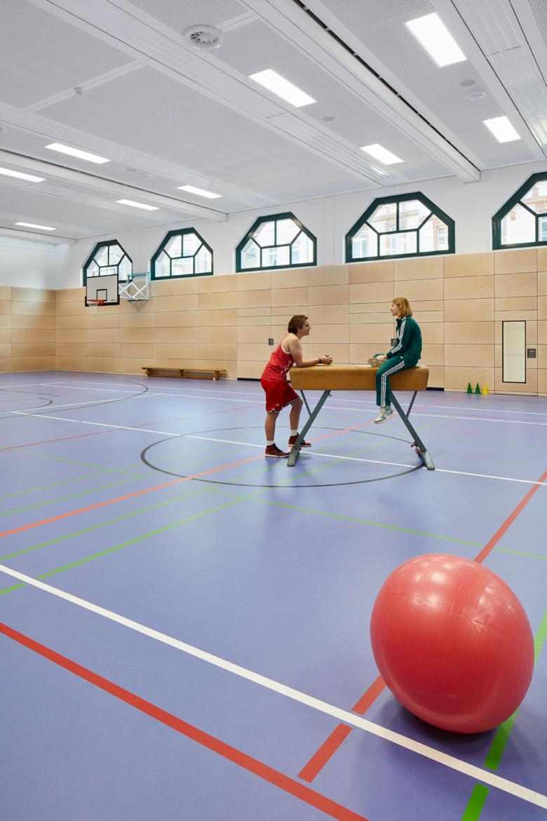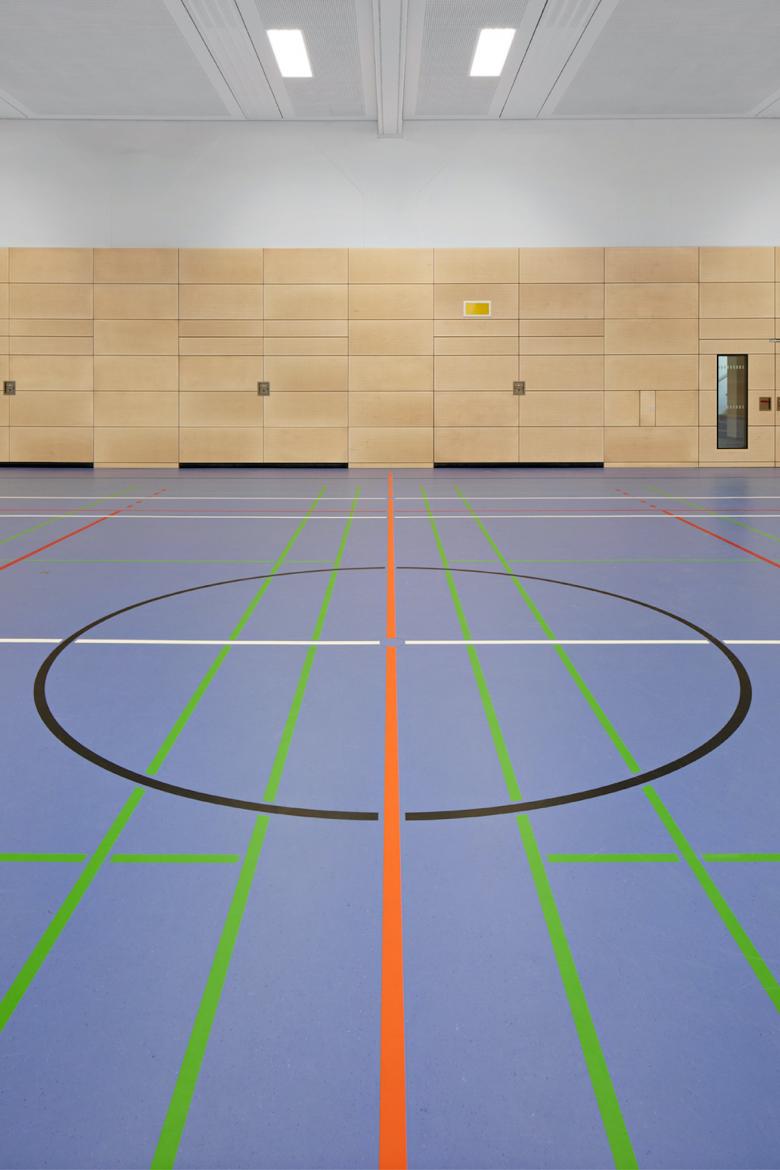Die dazugehörige Sporthalle wurden ebenfalls umfangreich saniert und im Zuge der Maßnahmen umfassend modernisiert. Neben den von der Straße aus sichtbaren und charakteristischen Oberlichtfenstern, hat die Halle nun auch durch eine neue Prallwandverkleidung aus Holz an Helligkeit gewonnen. Die Hallenwände sind nun einheitlich in einem Birkenholzfurnier verkleidet.