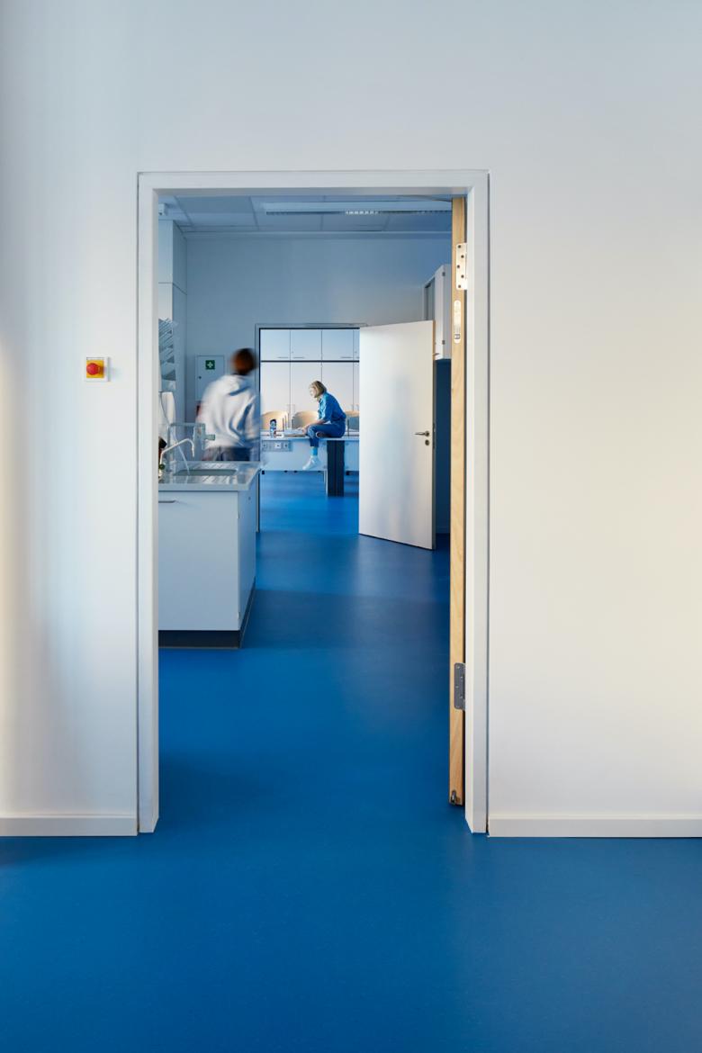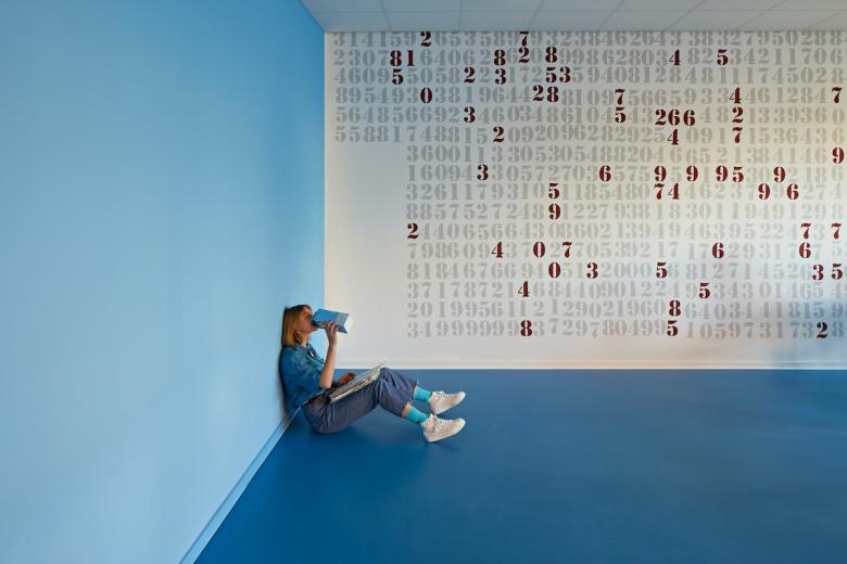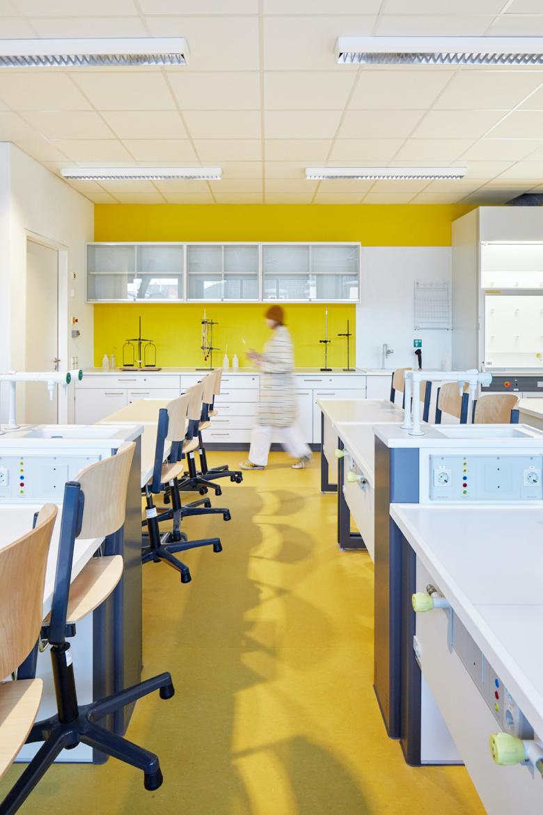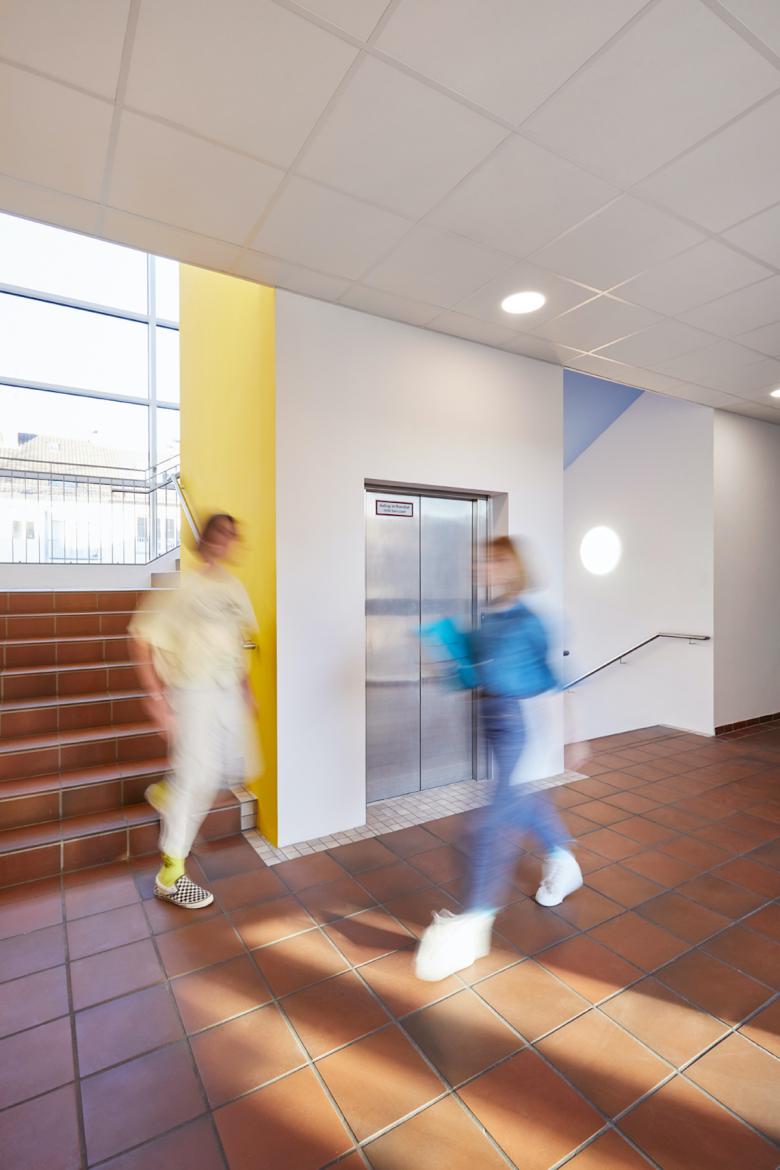 Eine Hauptkomponente der umfangreichen Sanierung war der Fokus auf die Entwicklung eines Leitsystems in Form eines neuen Farbkonzeptes. Hierfür wurde das bestehende Farbkonzept des Denkmalgeschützen Altbaus aufgegriffen und zu einem ganzheitlichen Gesamtkonzept weiterentwickelt. Die Renovierungsmaßnahmen umfassen drei Etagen mit Klassenräumen sowie die Etage der Sporthalle und die dazugehörigen Umkleideräume und Sanitäranlagen. Ausgehend von den Farben Gelb, Blau und Grün, wurde ein Farbkonzept implementiert, dass die Geschossfarben des Altbaus fortführt und so einen fließenden Übergang zum Bestandsgebäude herstellt. Die verschiedenen Stockwerke und die dazugehörigen Farben schaffen so, wie bereits im Altbau, eine räumliche Unterscheidung und einen thematischen Bezug zu den Räumlichkeiten.
