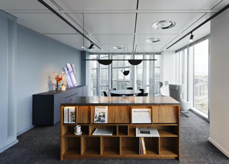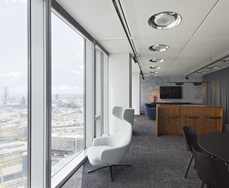Für die Neukonzipierung der common areas einer großen Anwaltskanzlei in der 25ten Etage des Main Towers haben wir durch die Entwicklung neuer Raumstrukturen einen ganz besonderen Rückzugsort für die Mitarbeiter geschaffen. Aus der neuentstandenen Mitarbeiterlounge heraus genießt man einen panoramaartigen Ausblick auf die Frankfurter Innenstadt. Ein abgestimmtes Farb- und Material Konzept in Anlehnung an den geometrischen Gebäudegrundriss schafft eine ruhige Atmosphäre, welche die Hochwertigkeit und das Mindset der Kanzlei widerspiegelt.