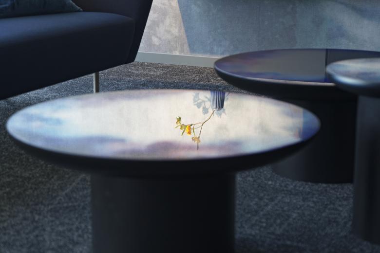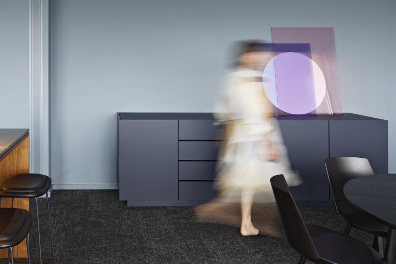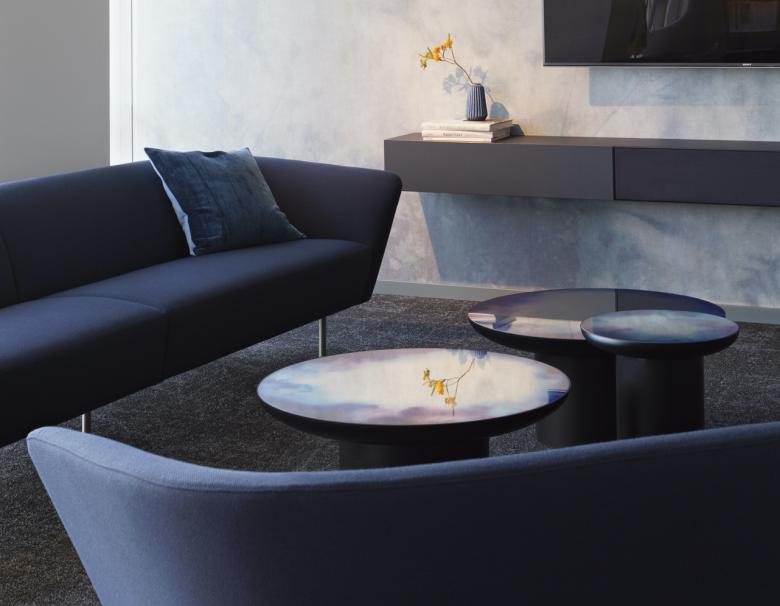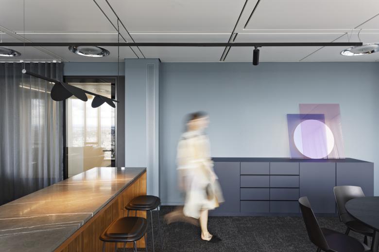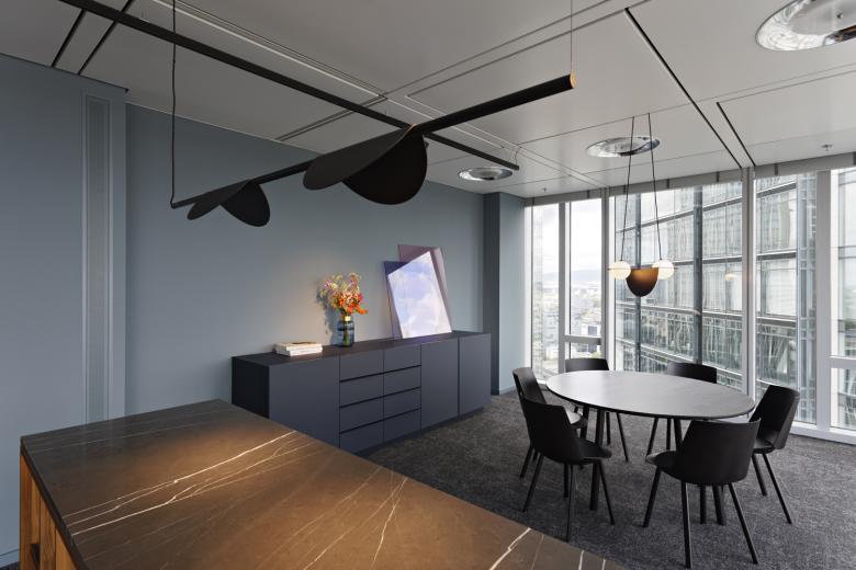 Im hinteren Bereich der neu entstandenen Mitarbeiterlounge wird mit den Erwartungen an die klassische Raumstruktur eines Meetingraumes gespielt. Der runde Esstisch bietet die Möglichkeit, sich in einer Gruppe zusammenzufinden, neue Ideen zu besprechen und dabei den Blick über die Skyline schweifen zu lassen. Besonders harmonisch wirkt die Kombination ruhiger Blautöne der Wände mit den hochwertigen Oberflächen der Möblierung, die dem Raum seinen besonderen Charakter verleiht.