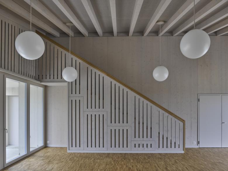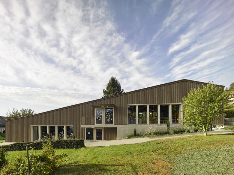 Der Bau ist wie bis anhin zweigeschossig organisiert und gliedert sich neu in fünf symmetrisch angeordnete Raumschichten. Die Zugangswege an der Nordfassade führen zu den beiden übereinanderliegenden Garderoben in der mittleren Schicht. Über den Kern mit Treppe und Toiletten sind auf der Südseite der Lehrkraftbereich mit Küche und der Förderraum erreichbar. Die mittlere Schicht beinhaltet somit alle gemeinsam genutzten Räume und bildet das Zentrum des Gebäudes.