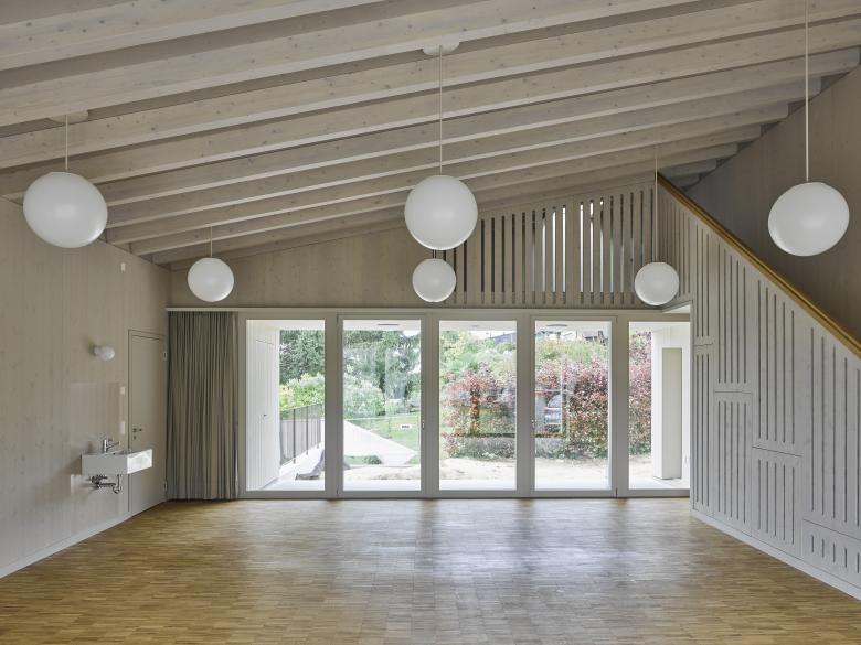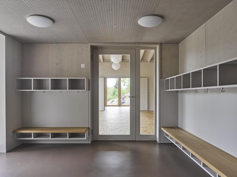Die äusserste Schicht ergänzt die Haupträume mit Gruppen- und Materialräumen. Die Schrankfronten in den Gruppenräumen bieten Stauraum. Die grossen Fenster orientieren sich nach Osten, resp. Westen, und schaffen den bislang fehlenden Bezug zu den Rasenflächen. Beide Basisstufen sind neu dreiseitig orientiert und behindertengerecht erschlossen.