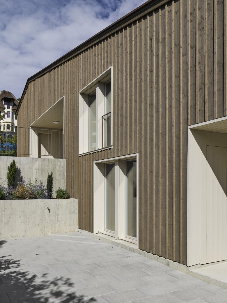 Die Erweiterungen verlängern das Gebäude und stärken die Idee eines der Hangtopographie folgenden Volumens. Die Basisstufe unterscheidet sich aufgrund ihrer Länge von den umliegenden Einfamilienhäusern und ist somit als öffentliche Einrichtung klar erkennbar. Die neuen Schichten sind an den beiden Knicken im Dach ablesbar. Durch die Knicke fügt sich das Gebäude besser in den Kontext ein und erhält beidseitig einen klaren volumetrischen Abschluss.