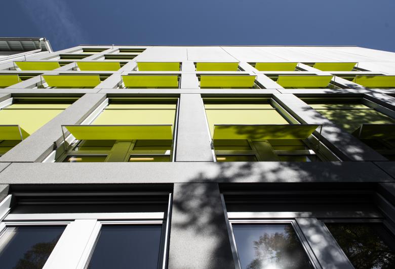 Im Schütze Areal wird fleissig gelernt. Und es lernt sich leichter, wenn das Raumklima angenehm ist. Die Vertikalstoren in natürlichem Grünton tragen massgeblich dazu bei. In den oberen und unteren Geschossen hat Kästli Storen über vier Meter hohe Storen entwickelt, die dank mitlaufenden Windstabilisationsrohren und beschwerter Fallstange hohen Windgeschwindigkeiten standhalten. Auch die in den mittleren Geschossen montierten windstabilen Ausstellstoren mit Gasdruckelementen wurden in filigraner Machart in der Belper Manufaktur fabriziert.
