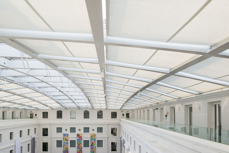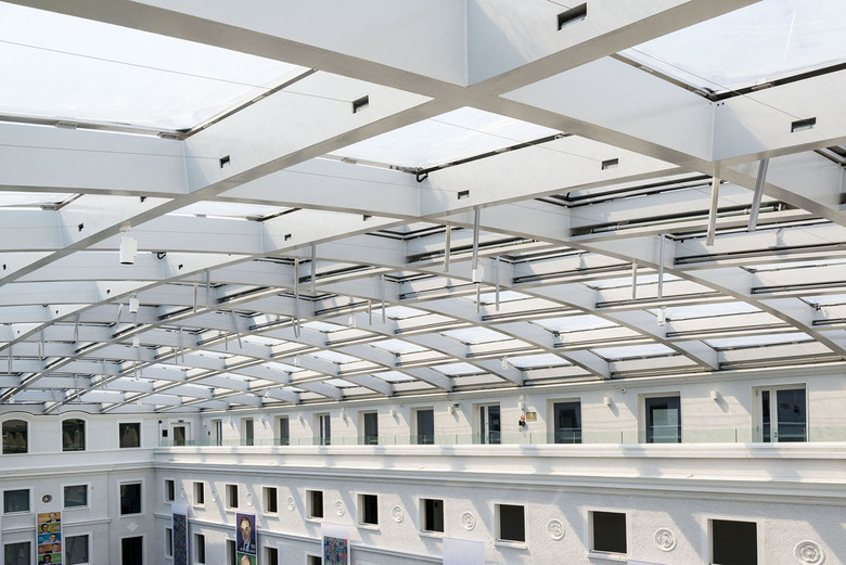 Beim Teilprojekt „intra-muros“ wurde der bestehende Innenhof mit einem riesigen Glasdach geschlossen. Unter der gewölbten Dachkonstruktion sind in den einzelnen 104 Feldern SUNLUX® 4500 eingebaut.