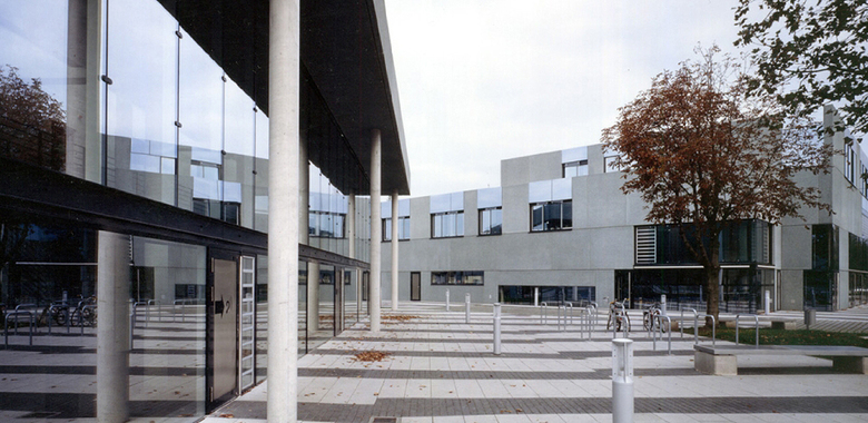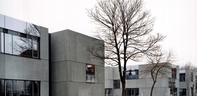 Wichtigste gestalterische Merkmale der drei Neubauten sind ihre kubische Form und die akzentuiert gestalteten Fassaden. Die kubische Wirkung der Gebäude wird durch die bündige Außenhaut unterstützt. Vorgehängte Fassadenplatten aus grünem Waschbeton sind in einem spannenden Wechselspiel mit flächenbündigen Gläsern angeordnet, so dass die Neubauten unerwartete Ein- und Ausblicke sowie vielfältige Belichtungssituationen gewähren.