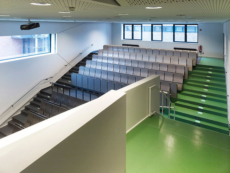 Nur der Hörsaal hebt sich von den zarten Tönen ab: zwischen Grün angelegten Boden- und Wandflächen finden künftig 135 Studenten Platz. Dabei macht der Hörsaal durch den Unterschnitt nicht nur zeichenhaft das Innere sichtbar, er ist vor allem markanter Blickbezug des Gebäudes und des gesamten Campus.