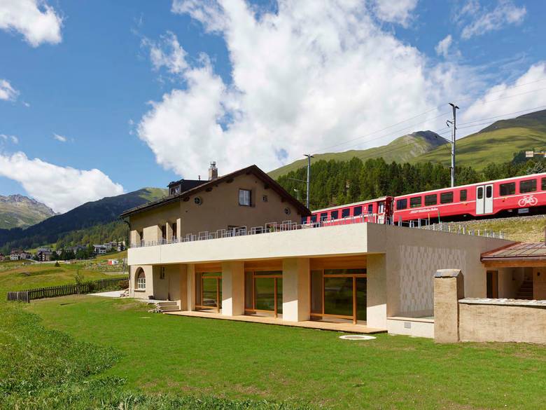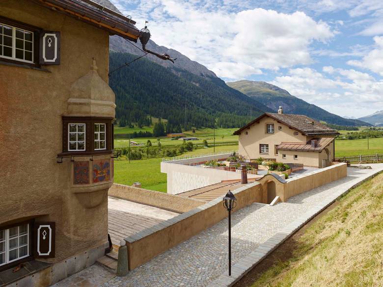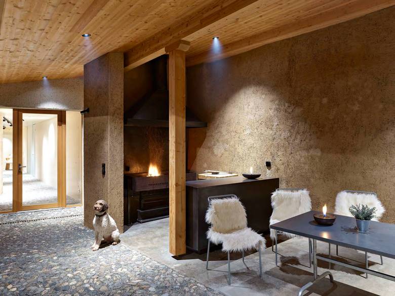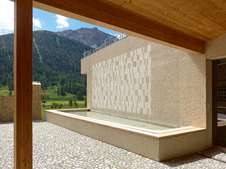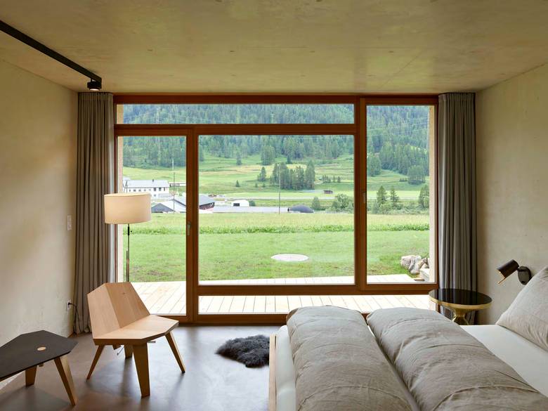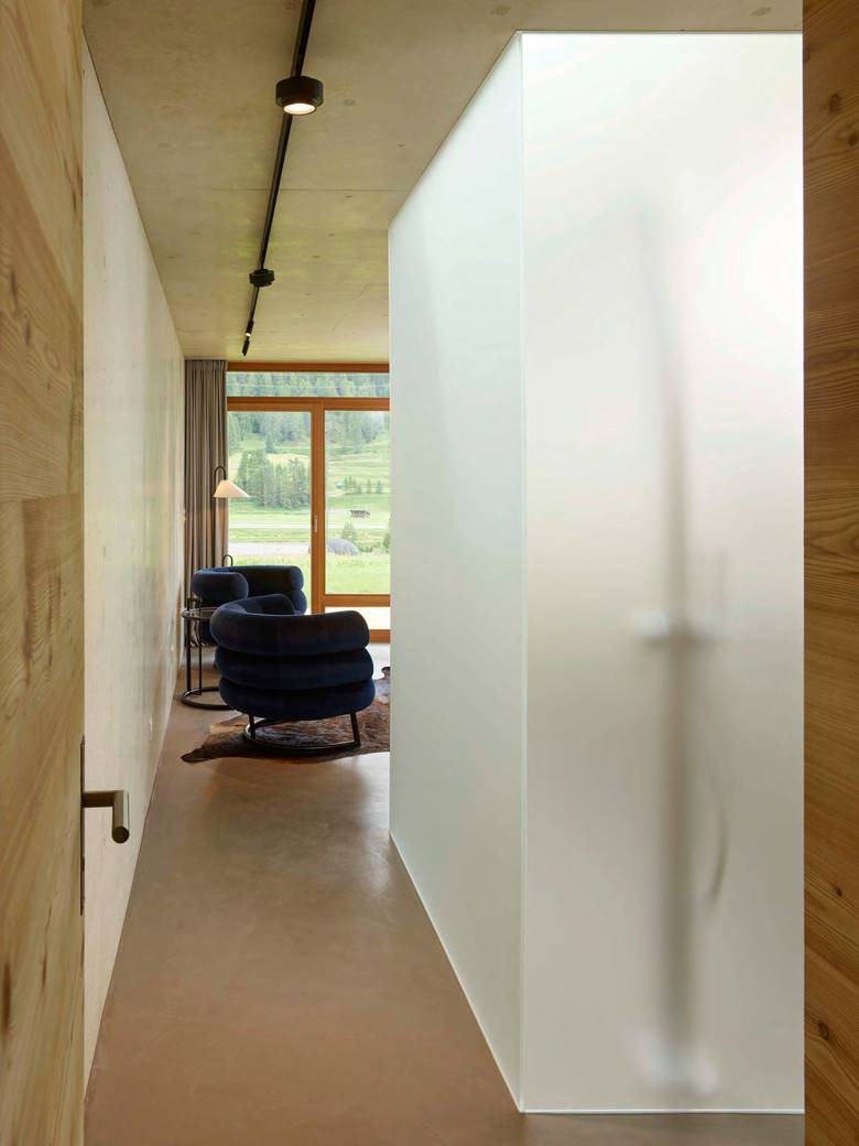 Auch die grossen Fenster, welche einen herrlichen Ausblick auf Engadiner Weide und Wald ermöglichen, sind aus Lärchenholz. Die Fussböden in den Zimmern wurden mit einer mineralischen Spachtelmasse versehen.
