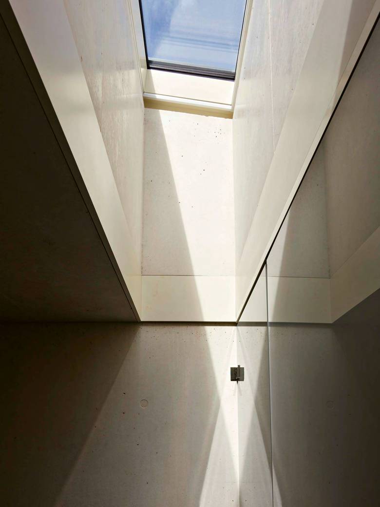 Der Sauna-Bereich und die Duschen in den drei Zimmern sind verglast und mit Oblichtern versehen. So leuchten diese Körper am Tag laternenartig, Nachts wird dieser Effekt mit Kunstlicht erzeugt.