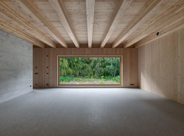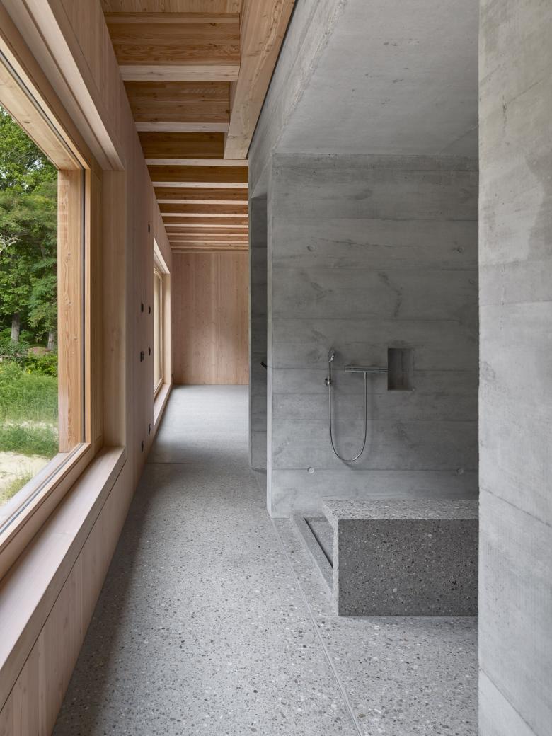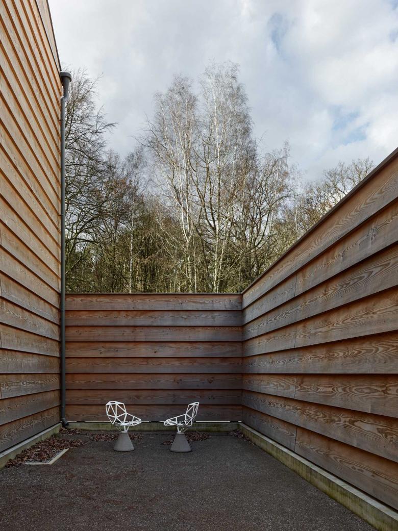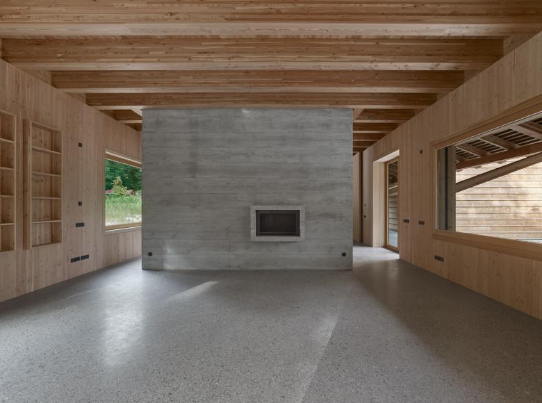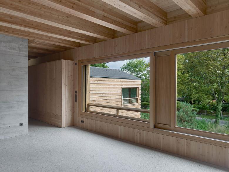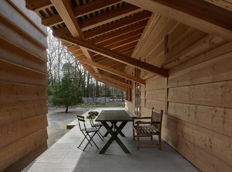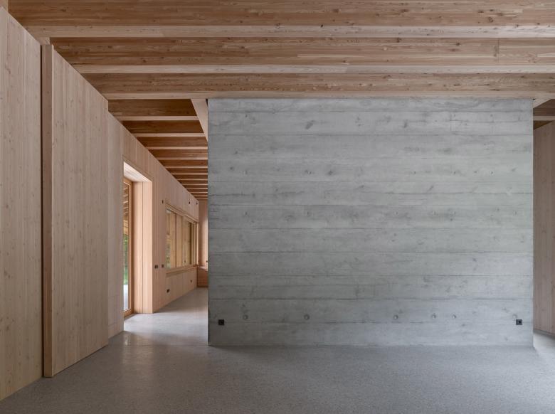 Der stereometrische Bezug der Baukörper untereinander entsteht durch präzise Setzung der Volumen um einen dreiseitig umschlossenen Innenbereich, welcher über ein Eingangsgebäude mit Garagenstellplatz erschlossen wird. Eine über die gesamte Länge des Hauptgebäudes laufende Veranda mit frei ausladendem Vordach bildet einen nach Süden gerichteten Aufenthaltsbereich und ist ein Ort der Begegnung.